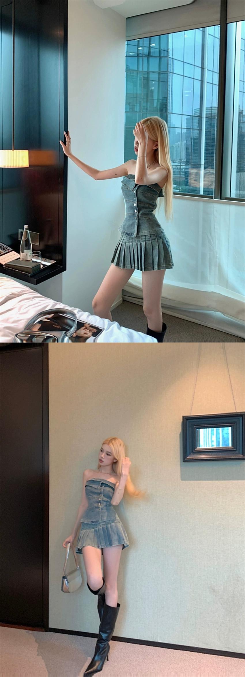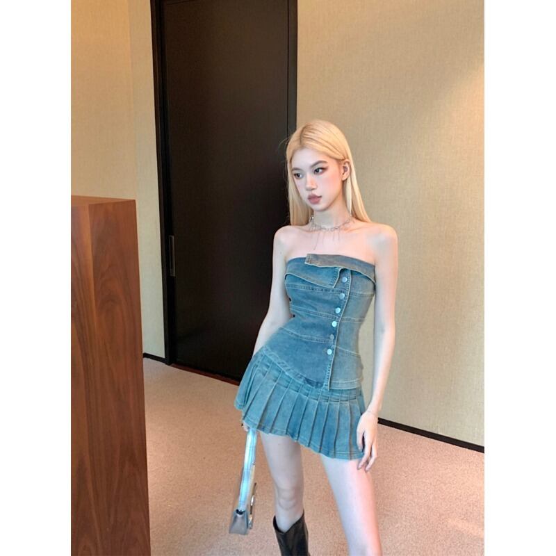 レトロデニムスーツ女性 2023 夏の新デザインチューブトップベストプリーツスカート 2 点セット サマー 夏物 0921985374385193