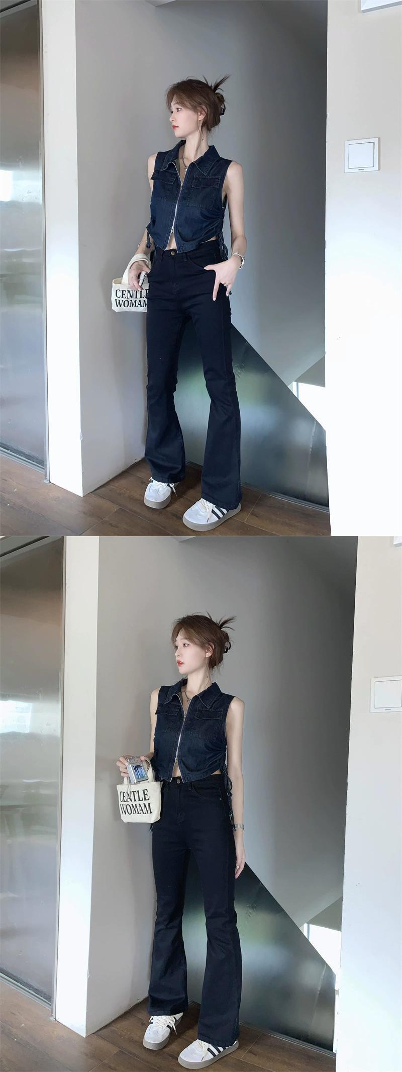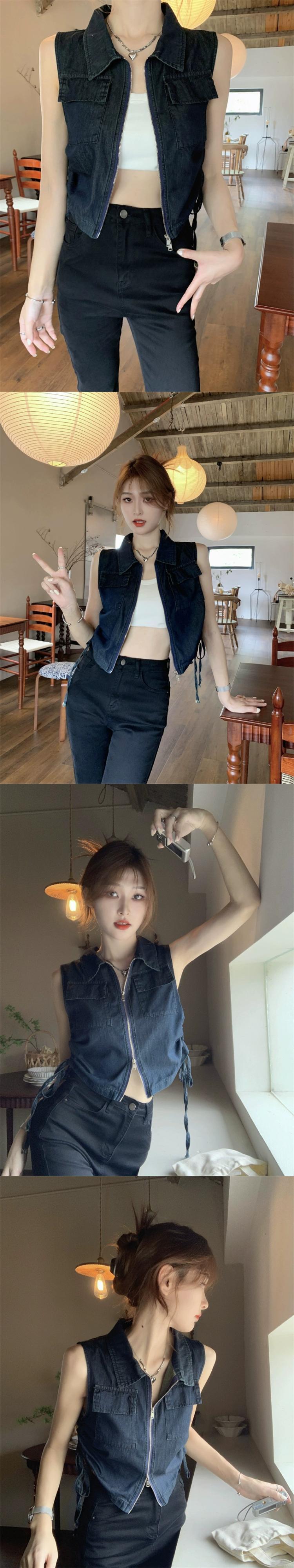 ポロカラージッパーデザインノースリーブシャツ女性の夏の 2023 新しい巾着ウエスト痩身デニムトップ サマー 夏物 0921989061617207