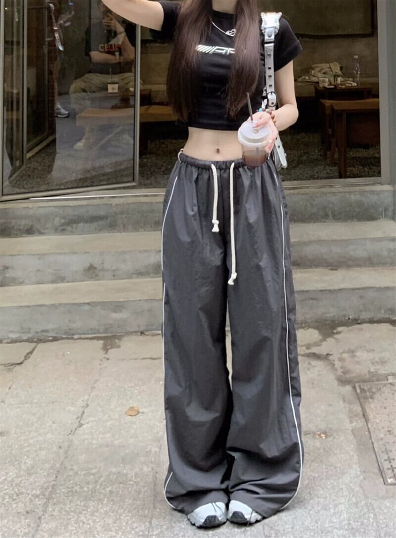 アメリカンレトロ巾着ハイウエストカジュアルパンツレディース夏薄手パンツグレーオールマッチスポーツワイドレッグパンツ ハイウェスト サマー 夏物 0921966528032810