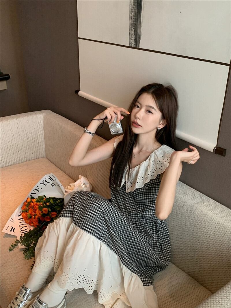 フレンチレトロレースステッチ V ネックドレス女性の夏の牧歌的なスタイルのサブロングスカートウエストフリルスカート サマー 夏物 Vネック 0921953808388614