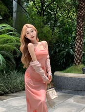 チャイナドレスの女性のピンクのハイエンドサスペンダースカート夏の純粋な欲望自己修養プリーツロングスカートセクシーなパッケージヒップスカート サマー 夏物 ピュア 0921980156256