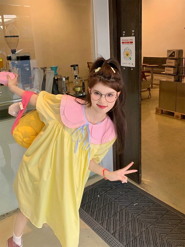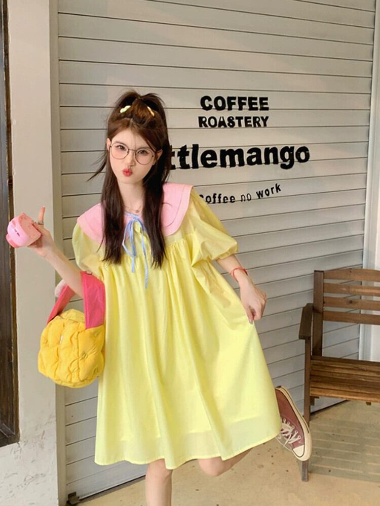 ドーパミン人形の襟コントラストカラードレス女性の夏ルーズ小さなaラインスカートバブルスリーブショートスカート サマー 夏物 0921957469873152