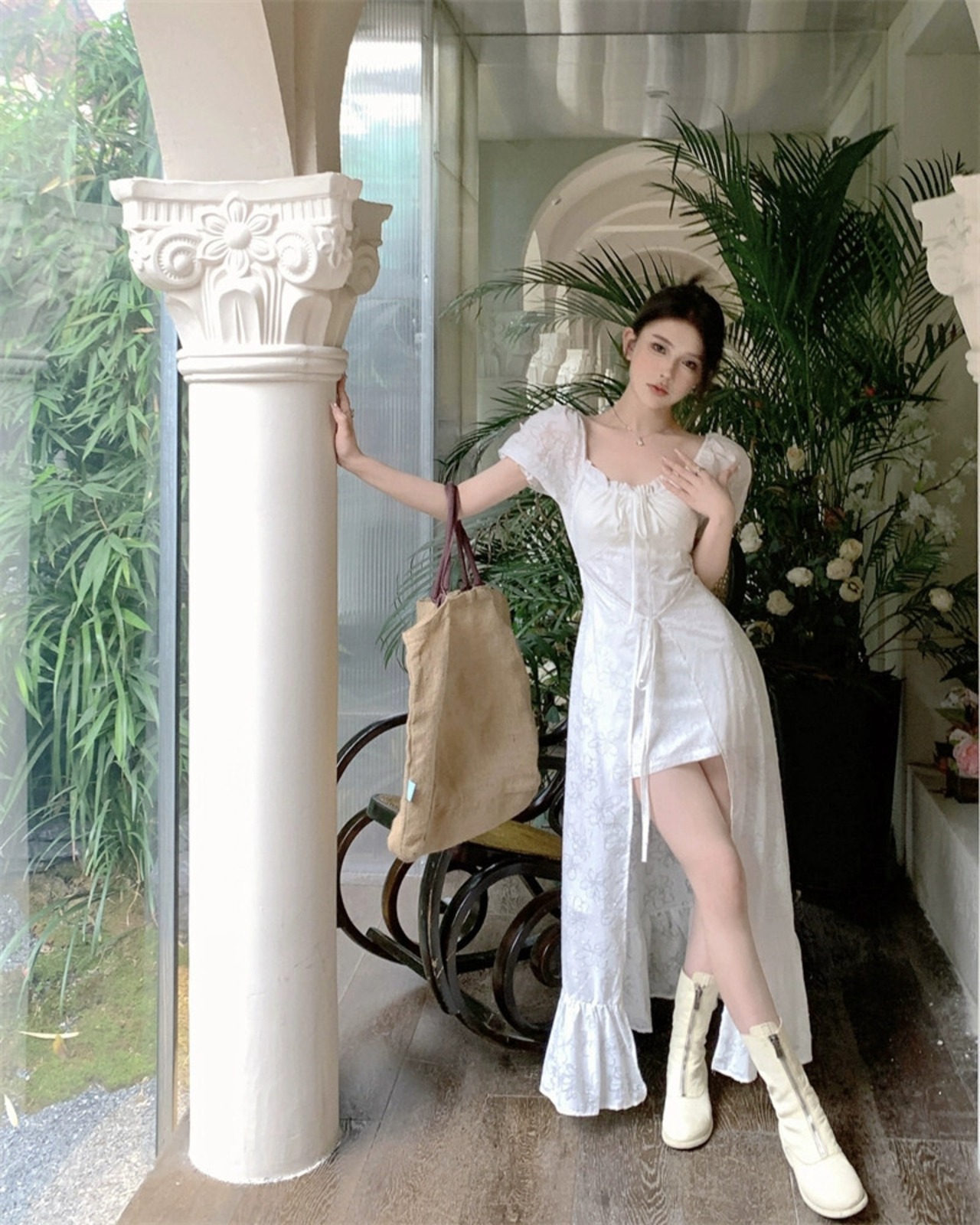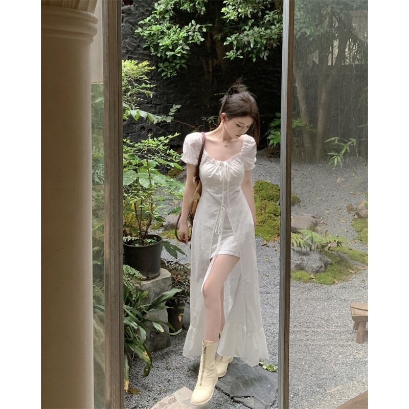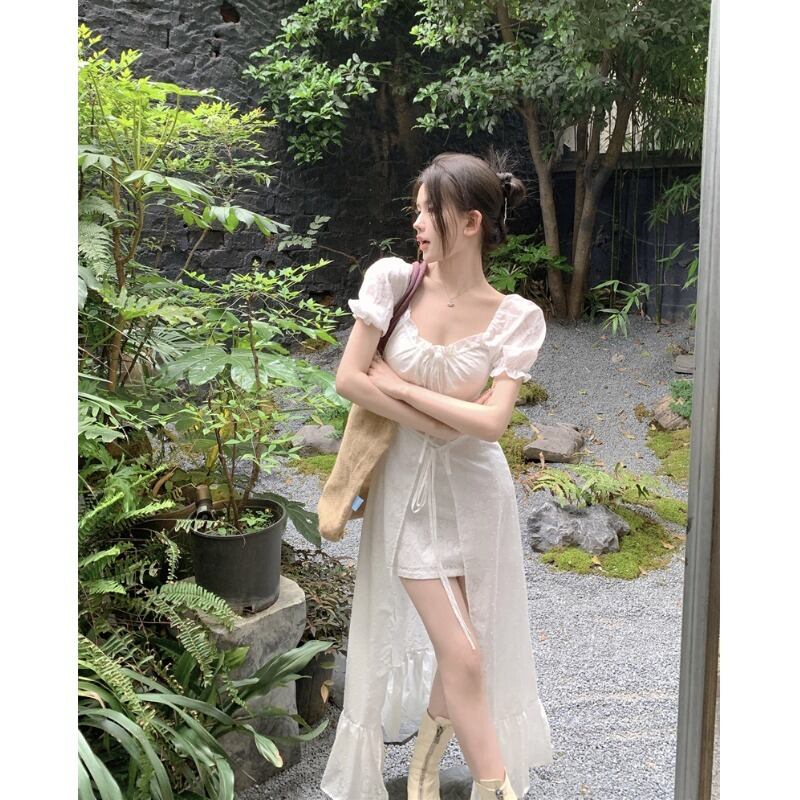 バレエスタイルの甘くてスパイシーなジャカードドレス女性の夏の2023新しいバブル半袖デザイン白いスカート ホワイト 大人ガーリー スウィート キュート カジュアル サマー 夏物 0921970446948113