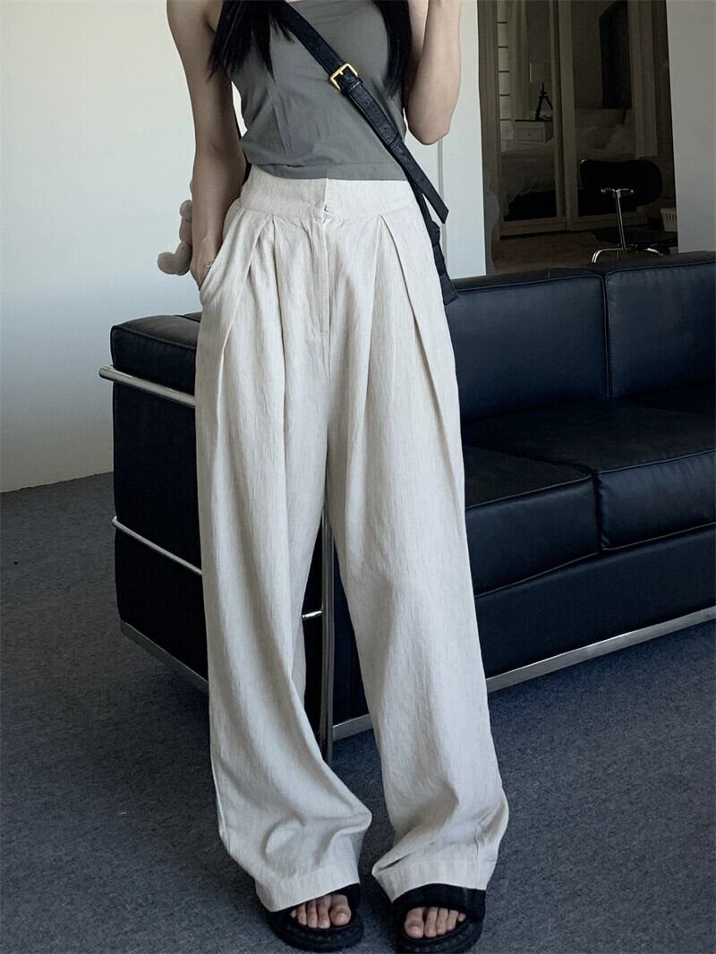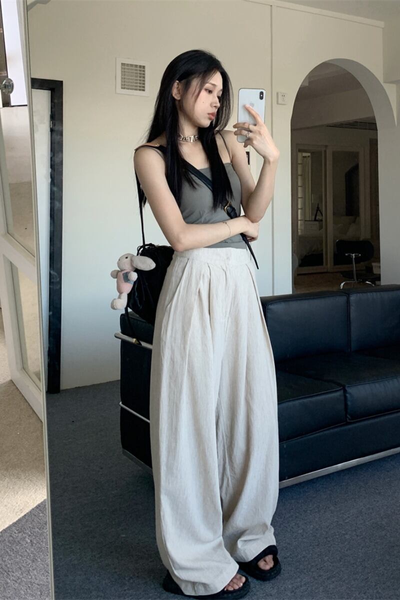 リネンモップカジュアルパンツ女性の夏小さなルーズハイウエスト垂直パンツコットンリネンワイドレッグパンツ ハイウェスト サマー 夏物 ワイドパンツ 092192154568963