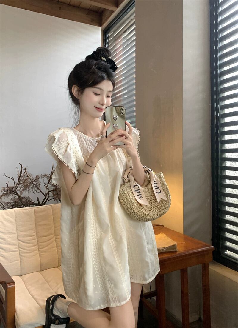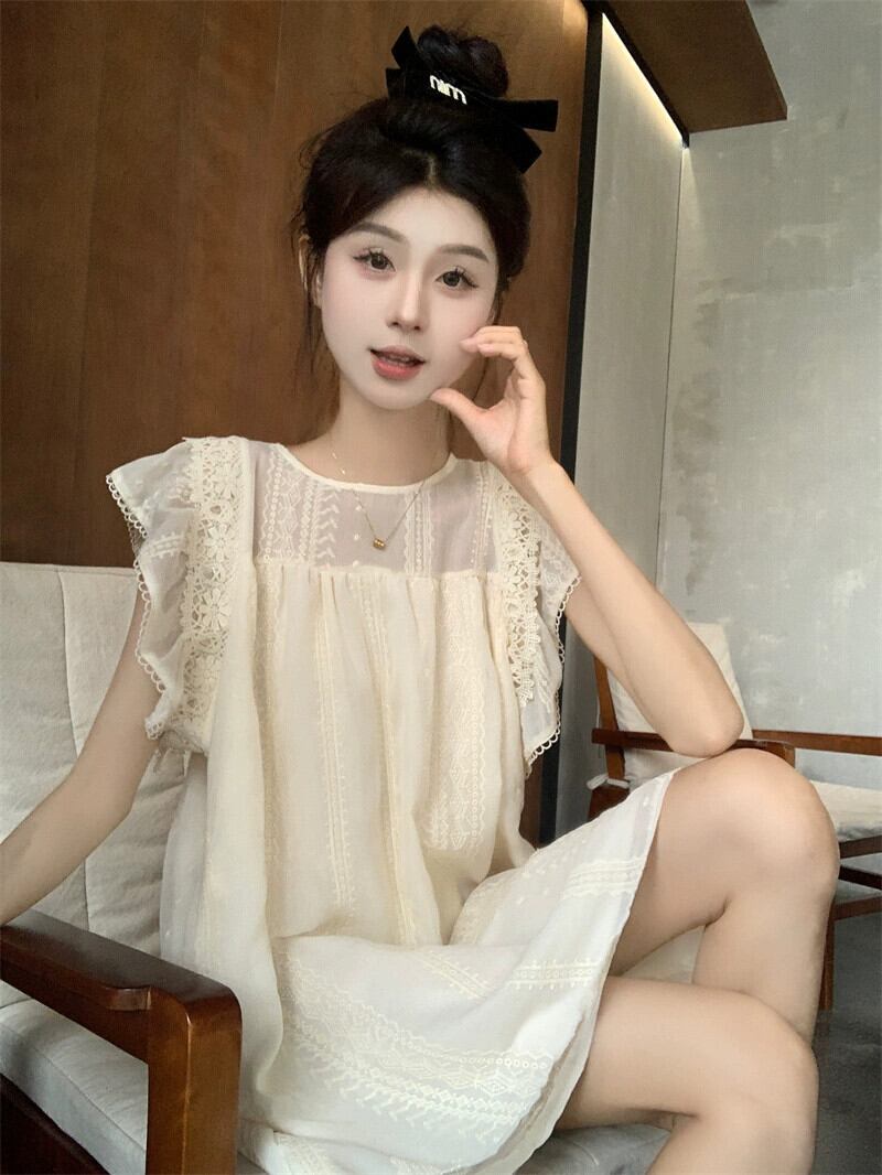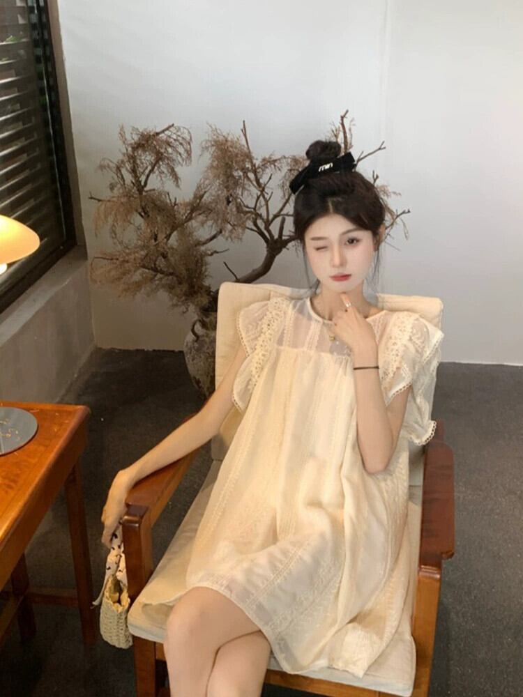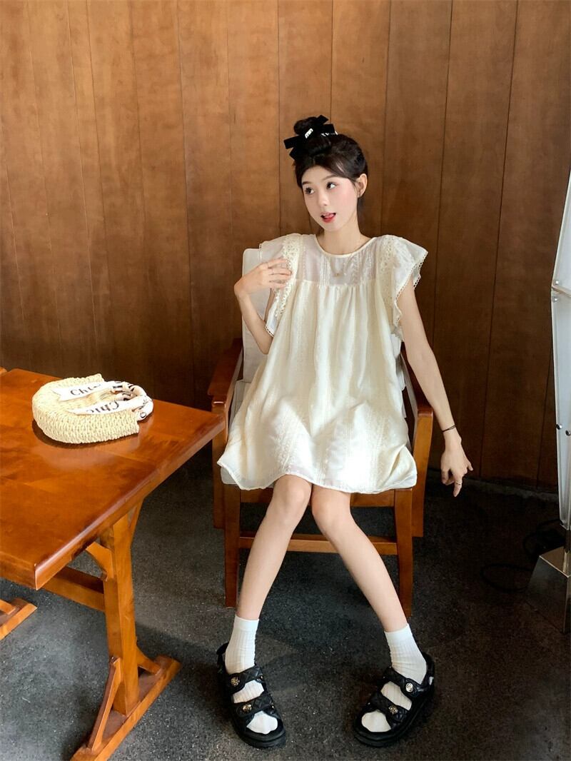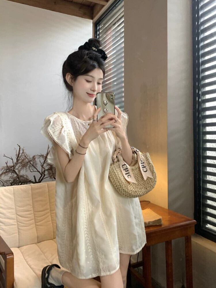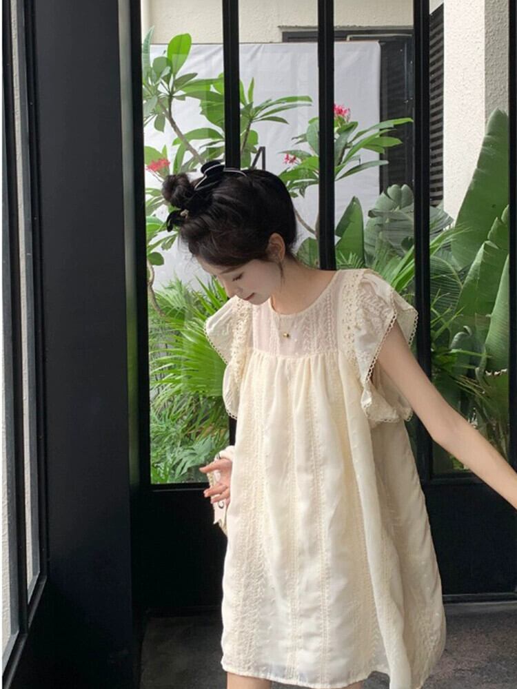 フランス重工業刺繍小さなフライングスリーブドレス女性の夏 2023 新しいオールマッチルーズで薄いショートドールスカート サマー 夏物 0921981208475065