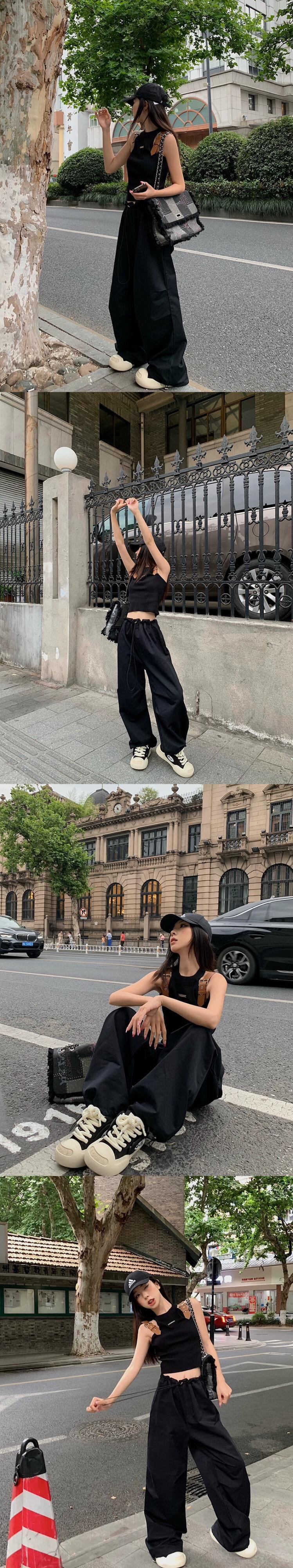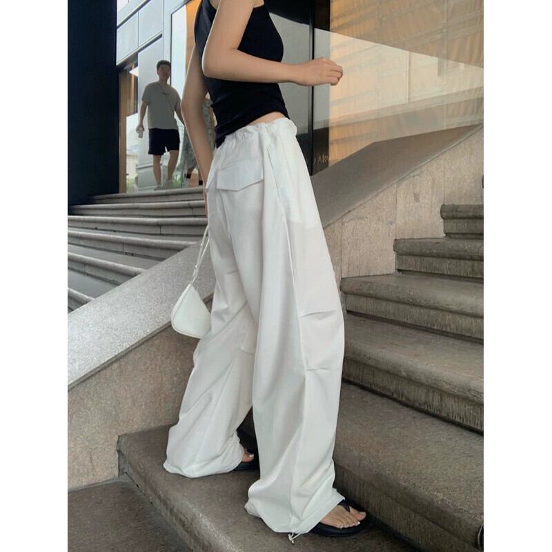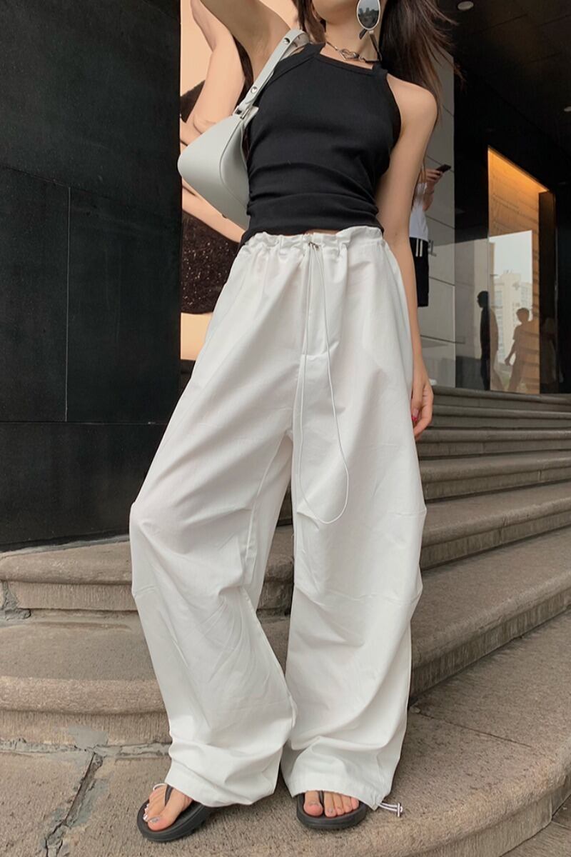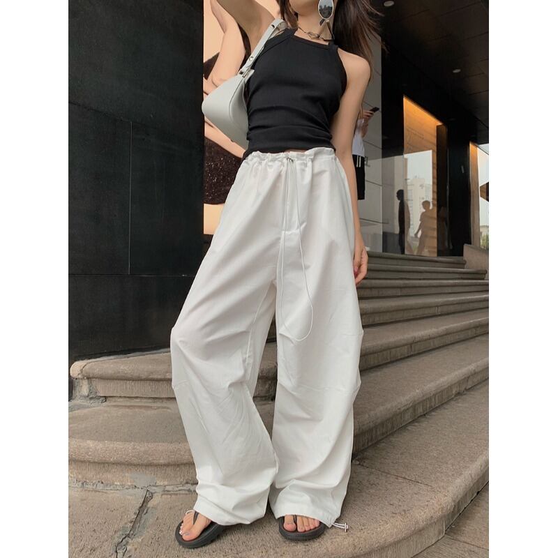 アメリカンストリートスタイルホワイトツーリングカジュアルパンツレディース2023年夏新作巾着ハイウエストルーズスリムワイドレッグパンツ ハイウェスト サマー 夏物 0921973443655592