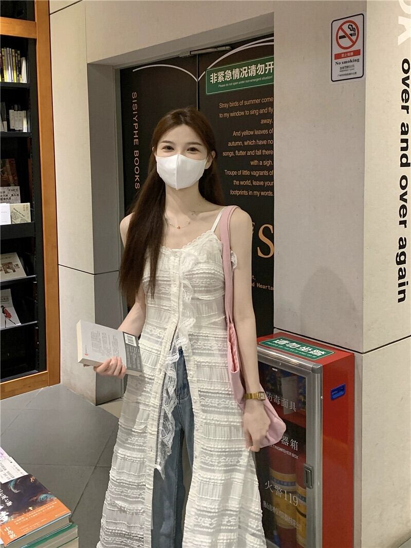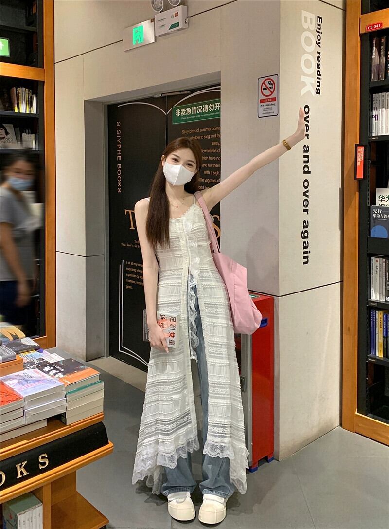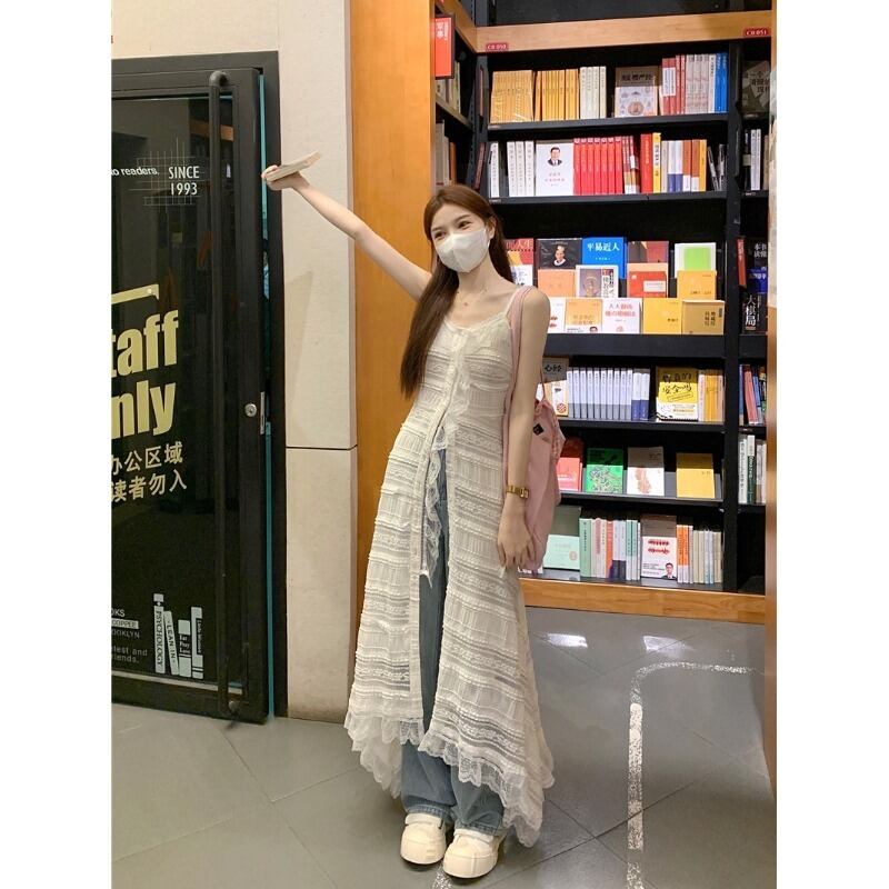 白いレースのスリングドレスの女性の夏の薄いセクション甘いスカートセクシーな気質vネックスリットスタックロングスカート ホワイト 大人ガーリー スウィート キュート カジュアル サマー 夏物 0921971077056500