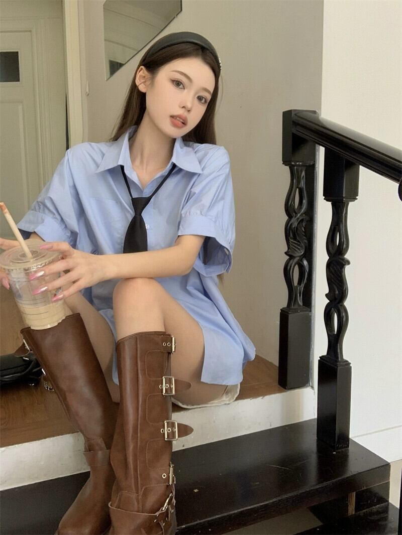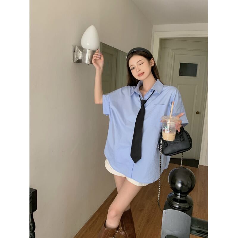 アメリカンカレッジスタイルブルー半袖シャツ女性の夏の2023新しいミッドレングスポロカラールーズで薄いシャツ サマー 夏物 0921971229068945