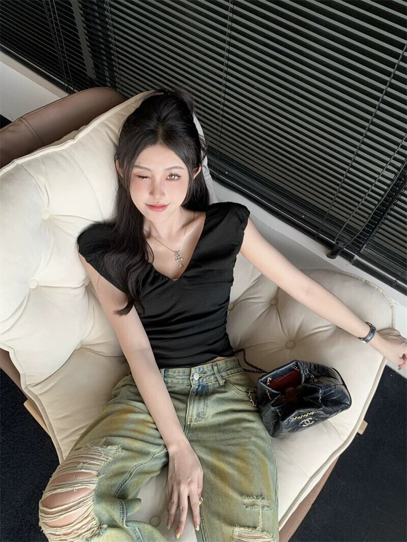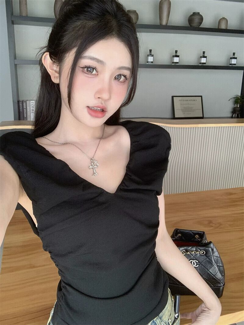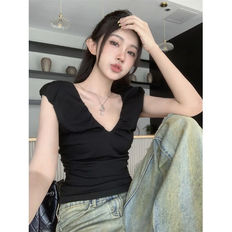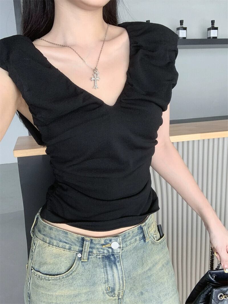 センスニッチ V ネックプリーツノースリーブ Tシャツレディース 2023 夏の新作ショートセクションスリムスリムプルオーバートップ潮 サマー 夏物 Vネック 0921966510329778