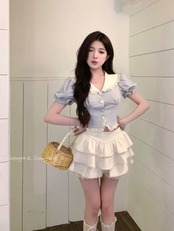 フレンチスイート y スタイルスーツ女性 2023 夏の新しいパフスリーブネイビーカラーシャツケーキスカート 2 点セット 大人ガーリー スウィート キュート カジュアル サマー 夏物 092194250109874