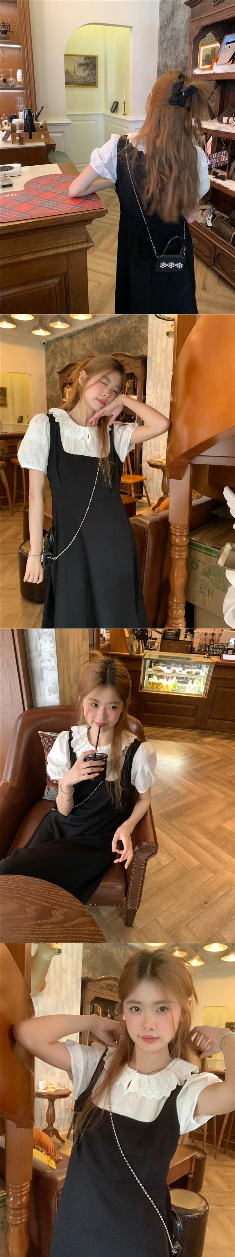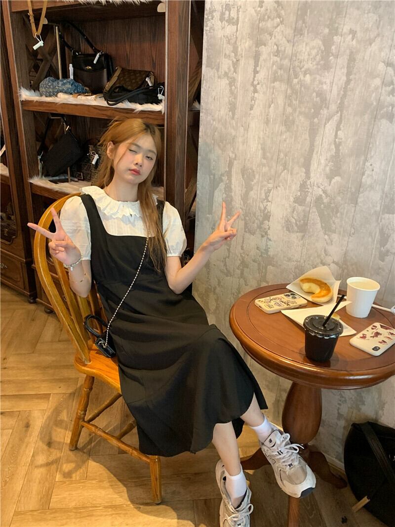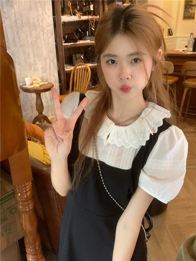 カレッジスタイル偽ツーピースドレス女性の夏のミッドレングススカートニッチ人形襟スプライシングパフスリーブスカート サマー 夏物 092198031050516