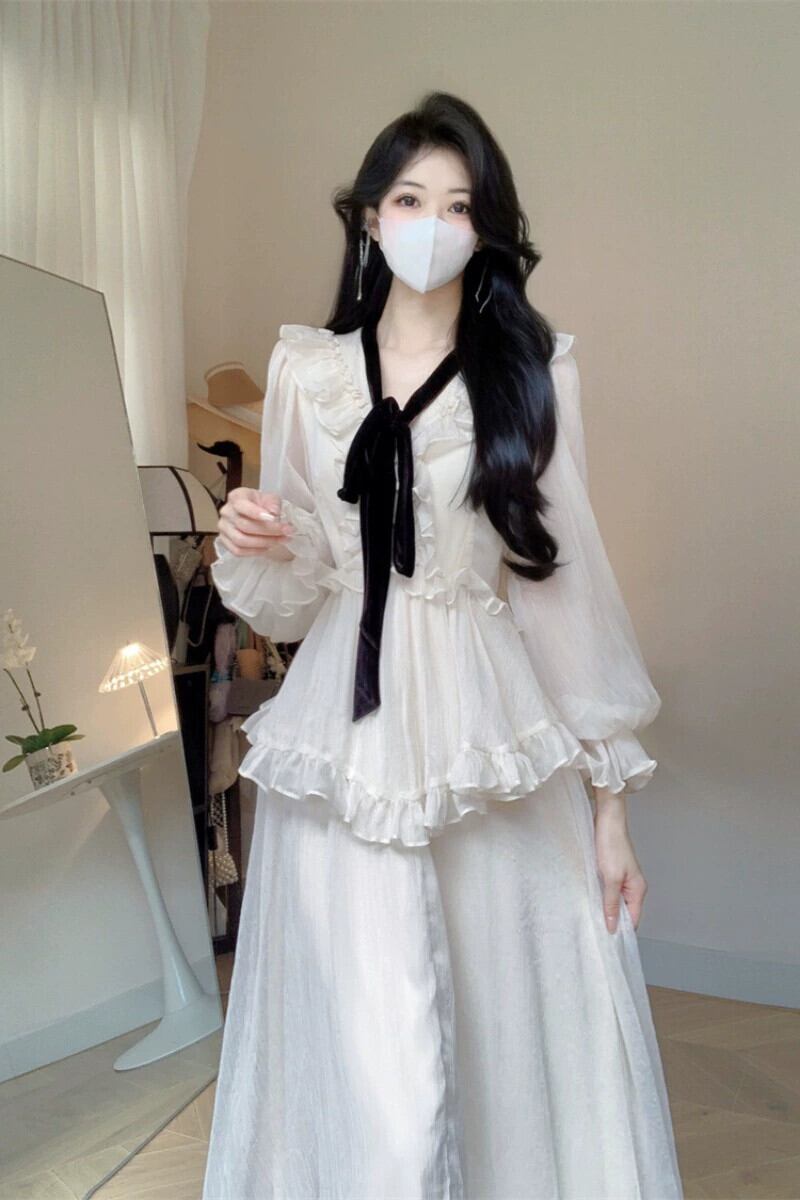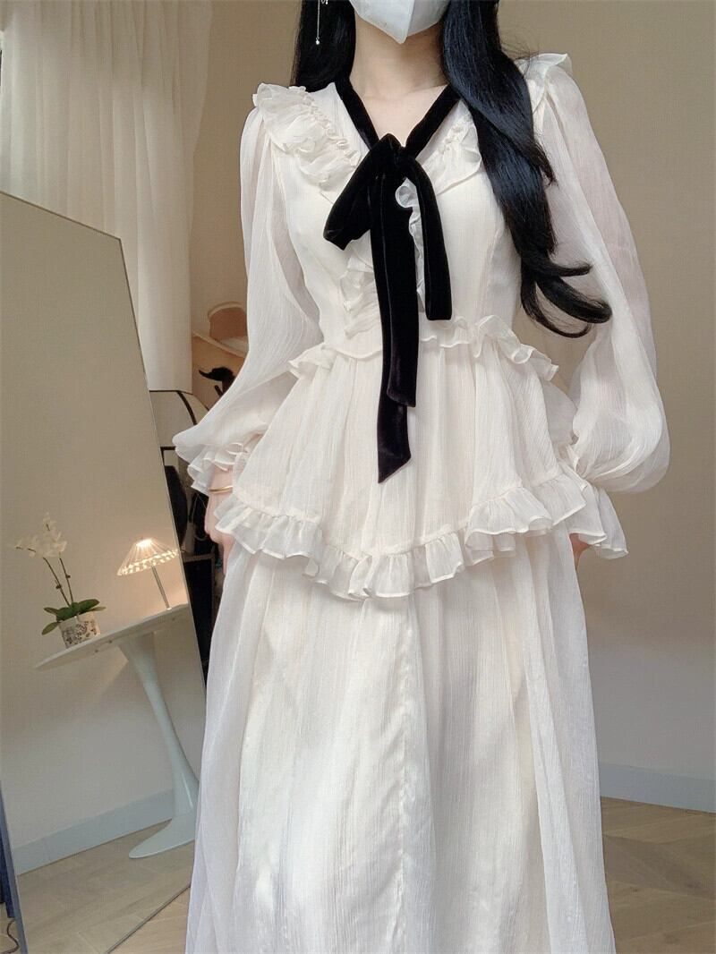 フレンチスタイルのレースアップ V ネック長袖ドレスの女性の夏 2023 新しいスタイルのレトロなハイエンドフリルロングスカート サマー 夏物 Vネック 0921995567510444