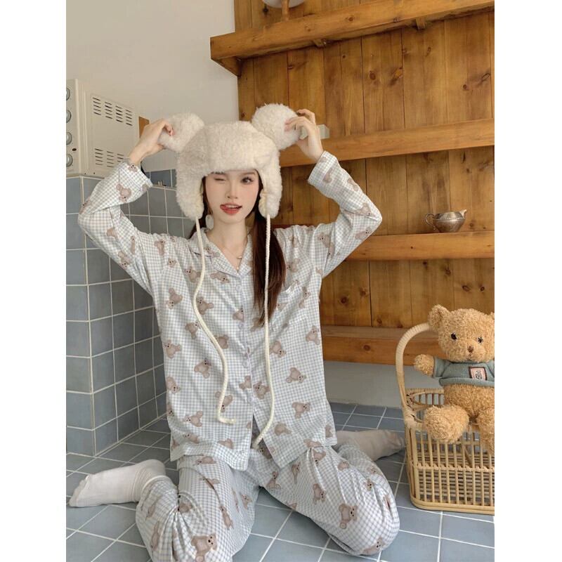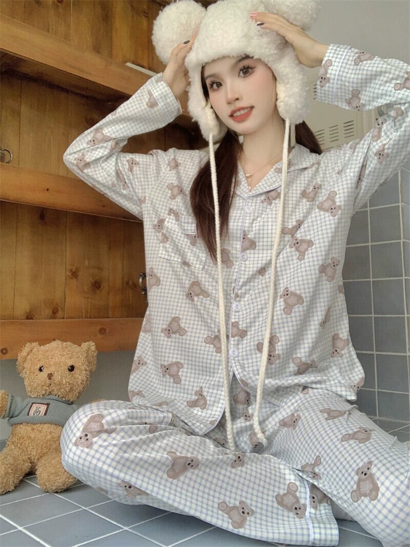ブルーチェック柄クマかわいいパジャマセット女性秋 2023 新しい長袖カーディガンパジャマホーム 2 点セット ロング 大人ガーリー スウィート キュート カジュアル オータム 秋物 0921910333445790