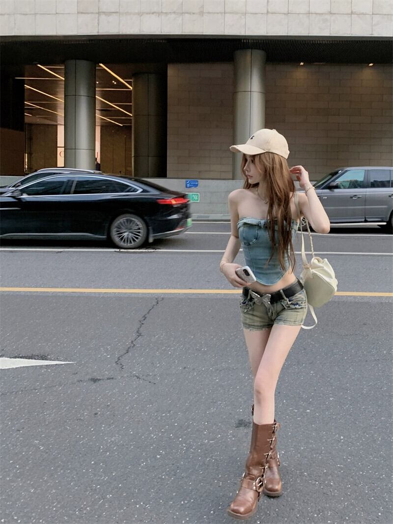 レトロなセクシーなデニム チューブ トップ女性夏蝶結び目スリム バックレス ショート トップ アウター リボン サマー 夏物 0921958853418381