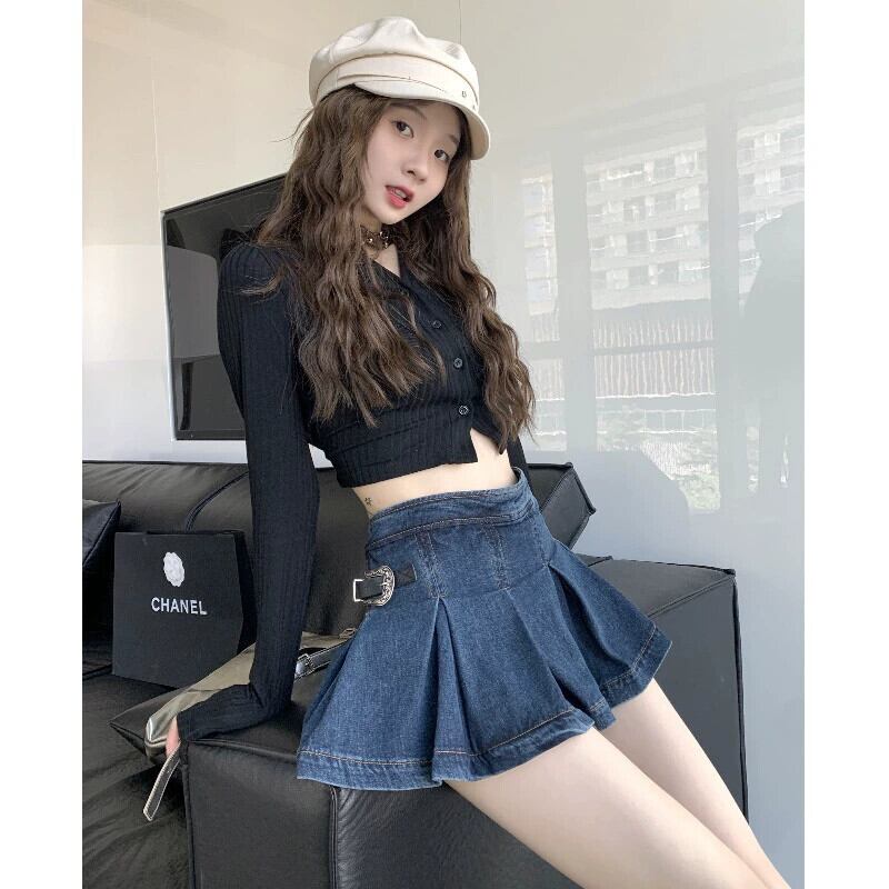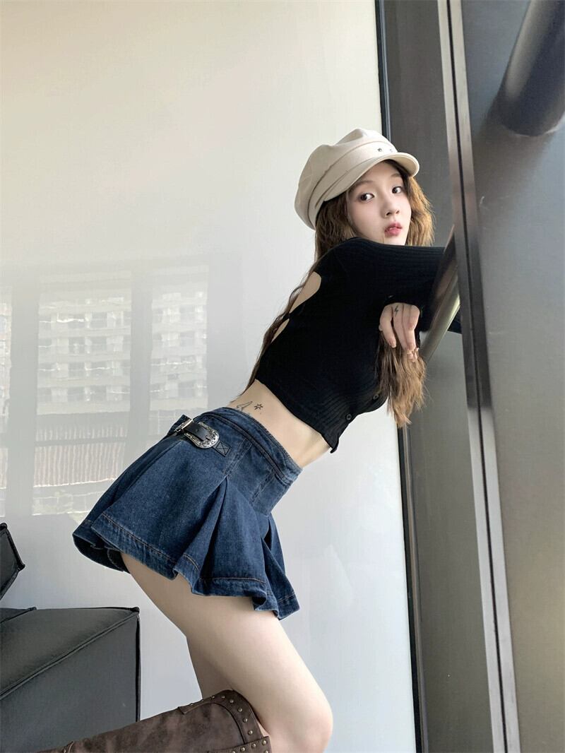 アメリカンレトロデニムスカートレディースサマーウエストプリーツAラインスカートリトルホットガールブルースカート 夏物 0921937804578469