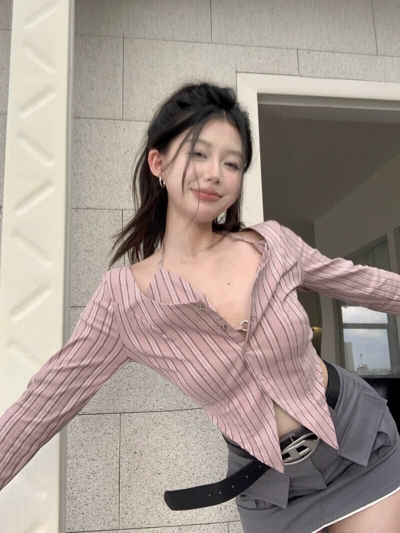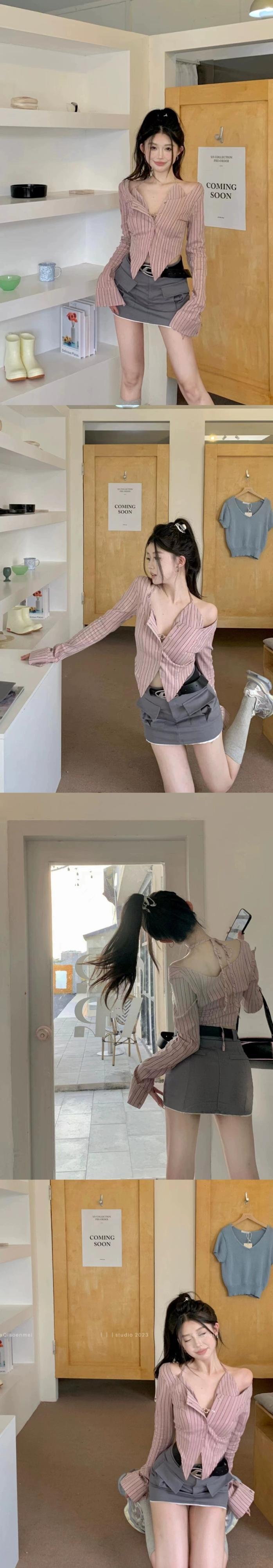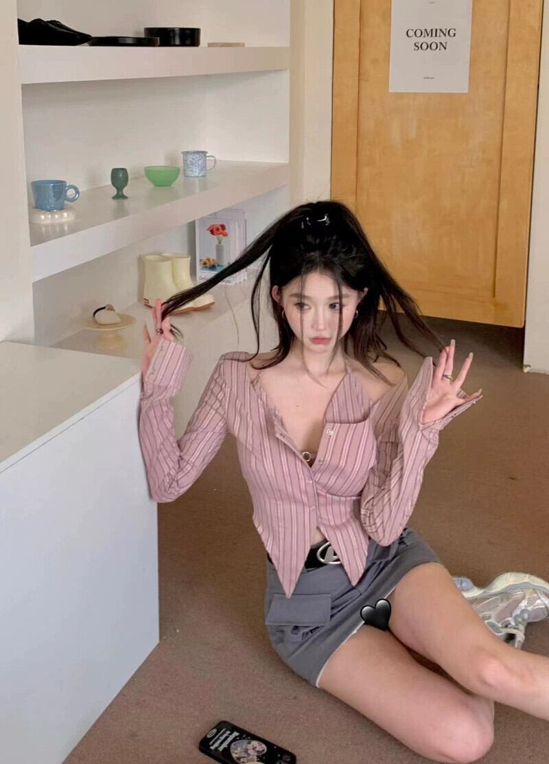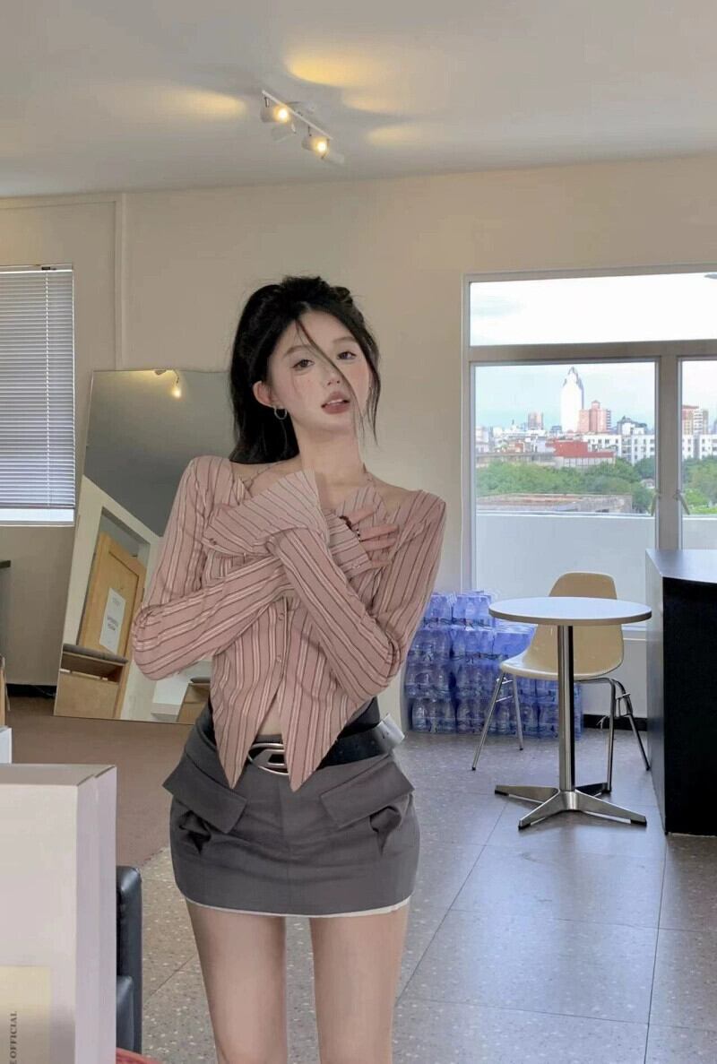 甘いホットガール純粋な欲望スタイルストライプシャツ女性の秋スリムアウターピンクシャツホルターネックホルタートップ 2 点セット 大人ガーリー スウィート キュート カジュアル オータム 秋物 ピュア 0921925132808917