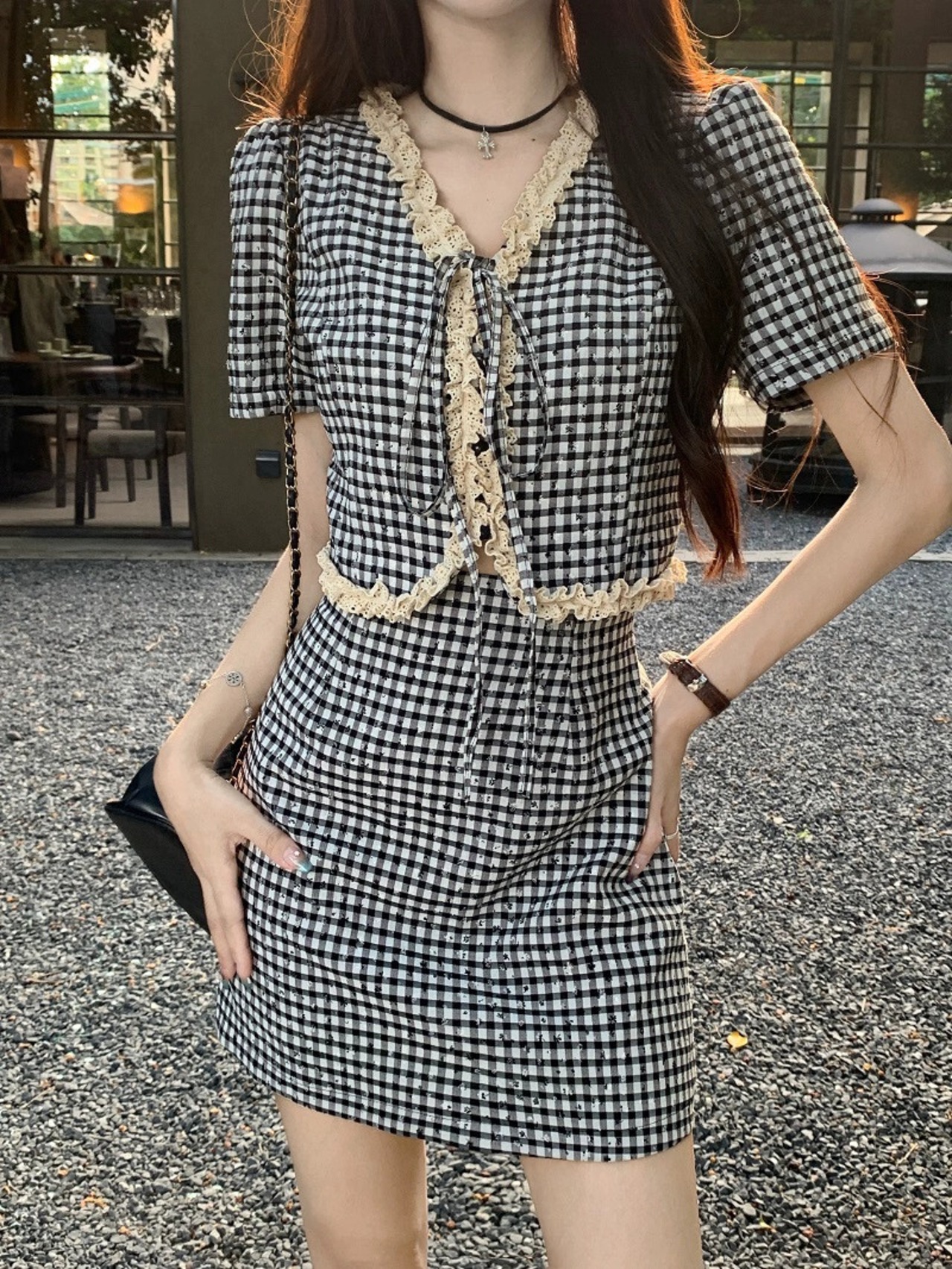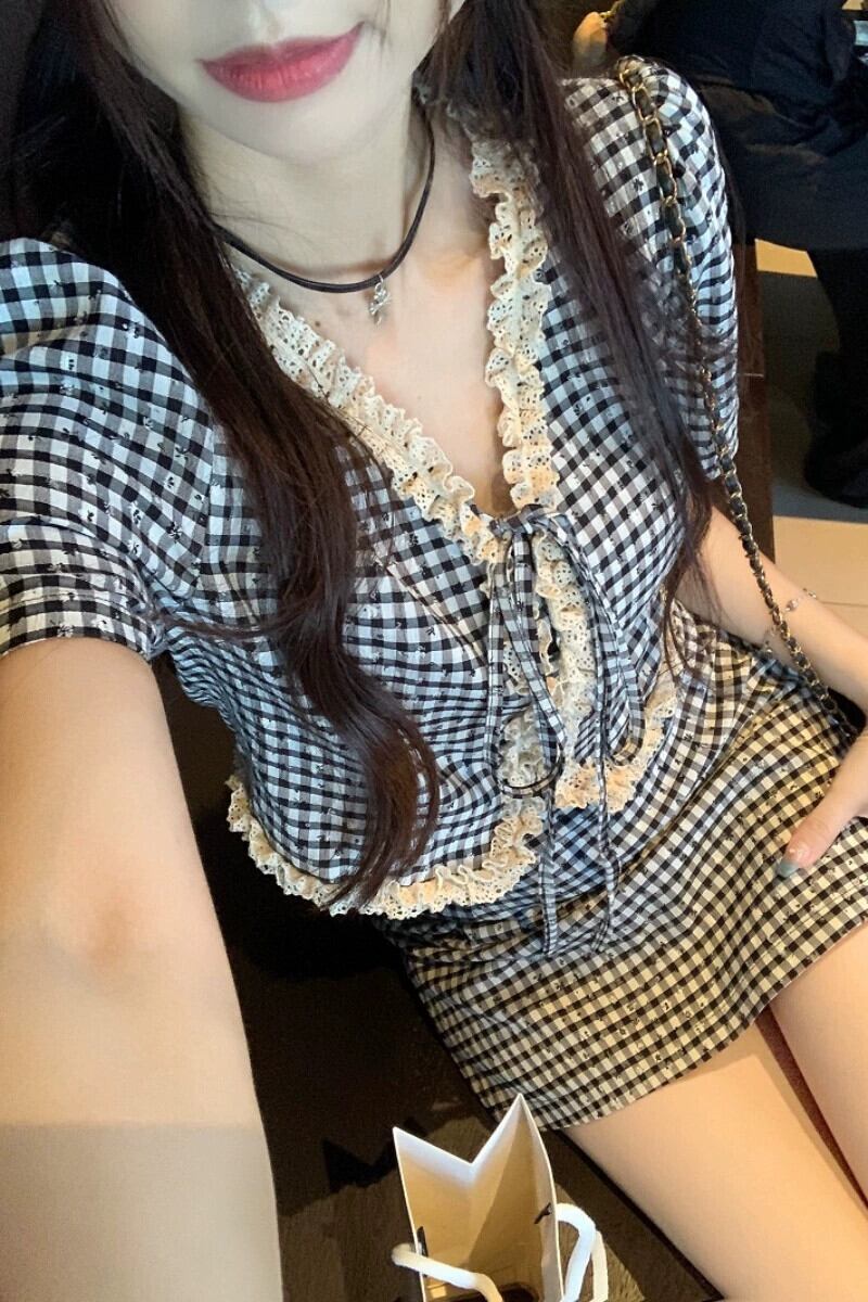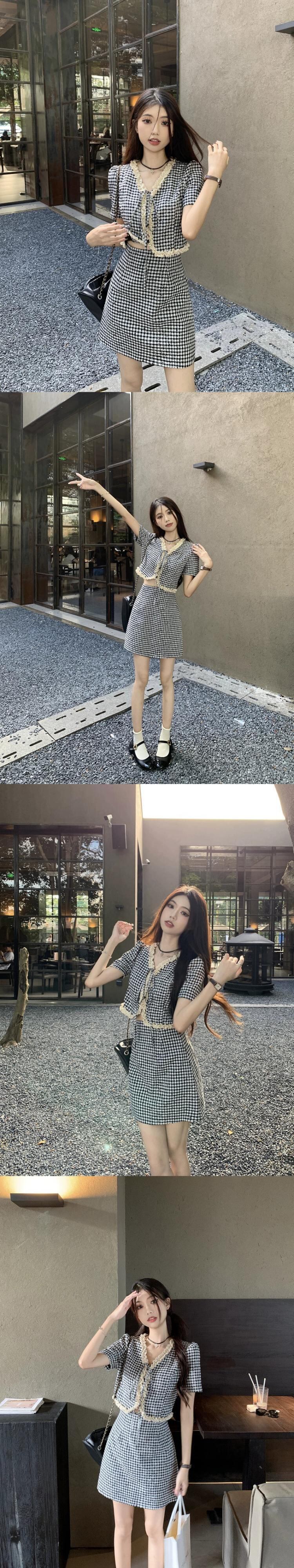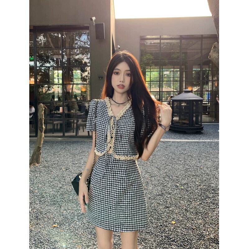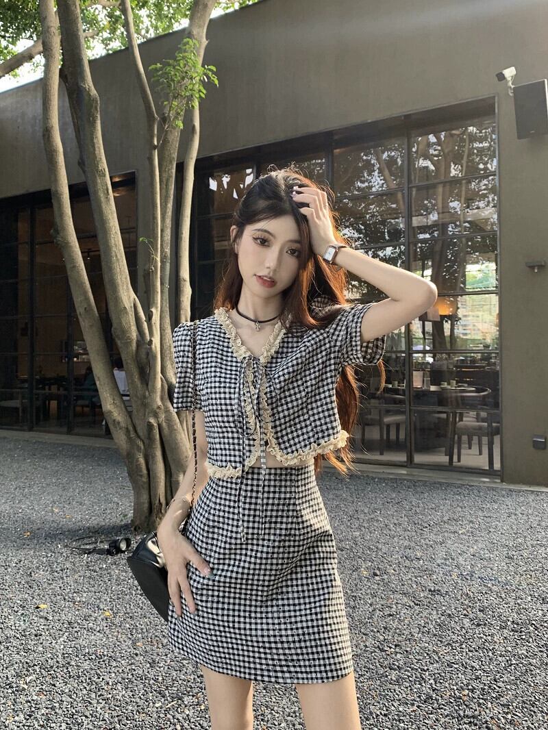 Xiaoxiangfeng 千鳥格子スーツスカート女性の夏の 2023 新しい半袖カーディガントップハイウエストスカート 2 点セット サマー 夏物 0921944122091686