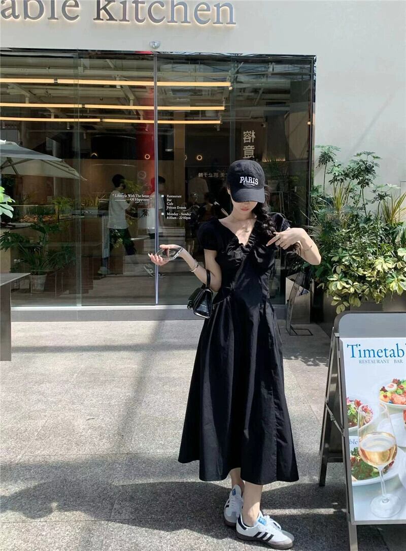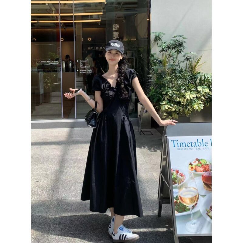 フレンチヘップバーンスタイルのレトロな V ネック黒のドレスの女性の夏の 2023 新しいパフスリーブ気質ウエストスカート ブラック サマー 夏物 Vネック 0921929020430389