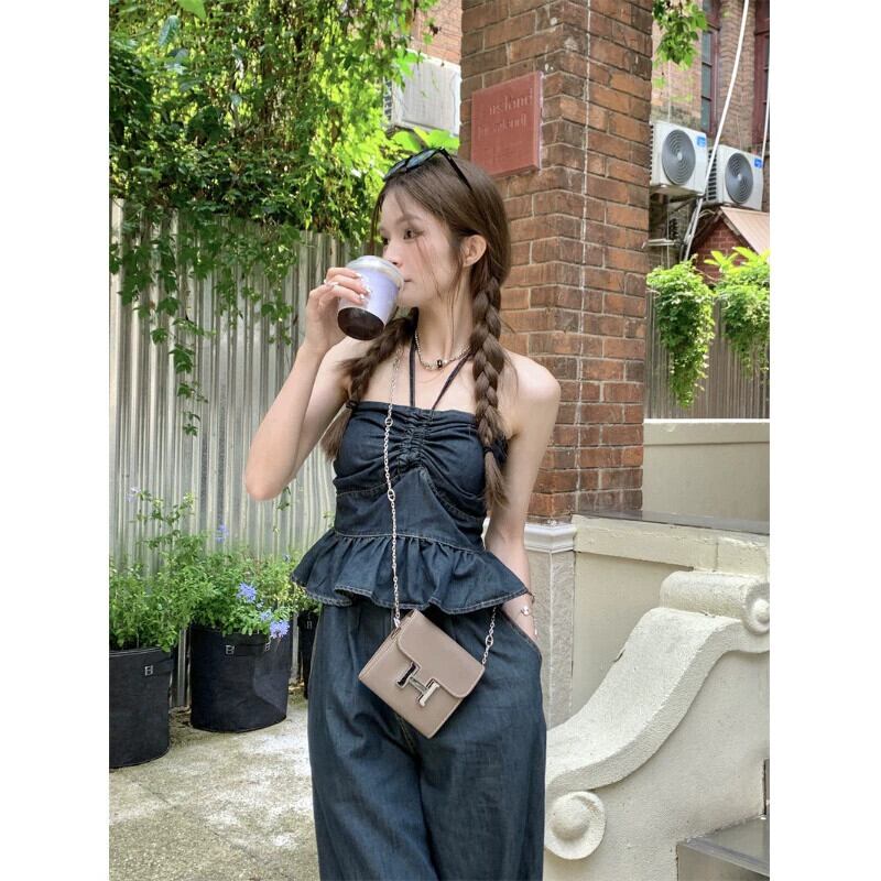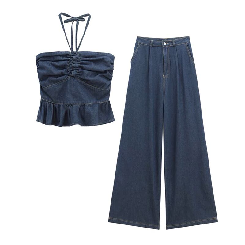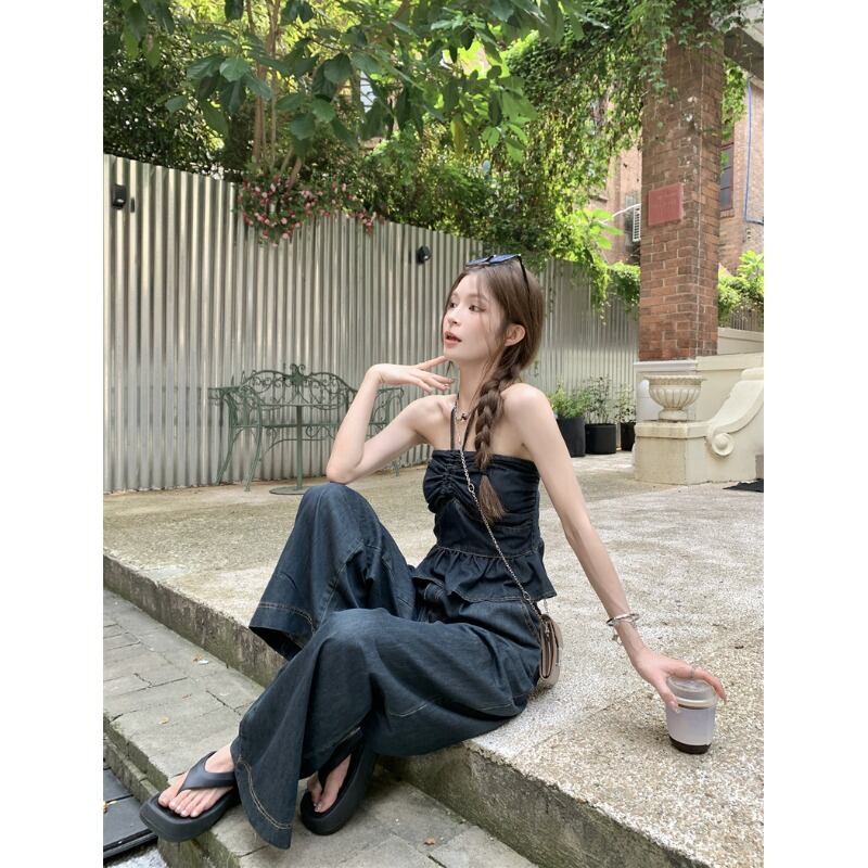 クールでスパイシーなデニムスーツの女性の夏 2023 新しいスタイルのホルターネックチューブトップトップルーズワイドレッグパンツツーピーストレンディなセット サマー 夏物 ワイドパンツ 0921977880103822