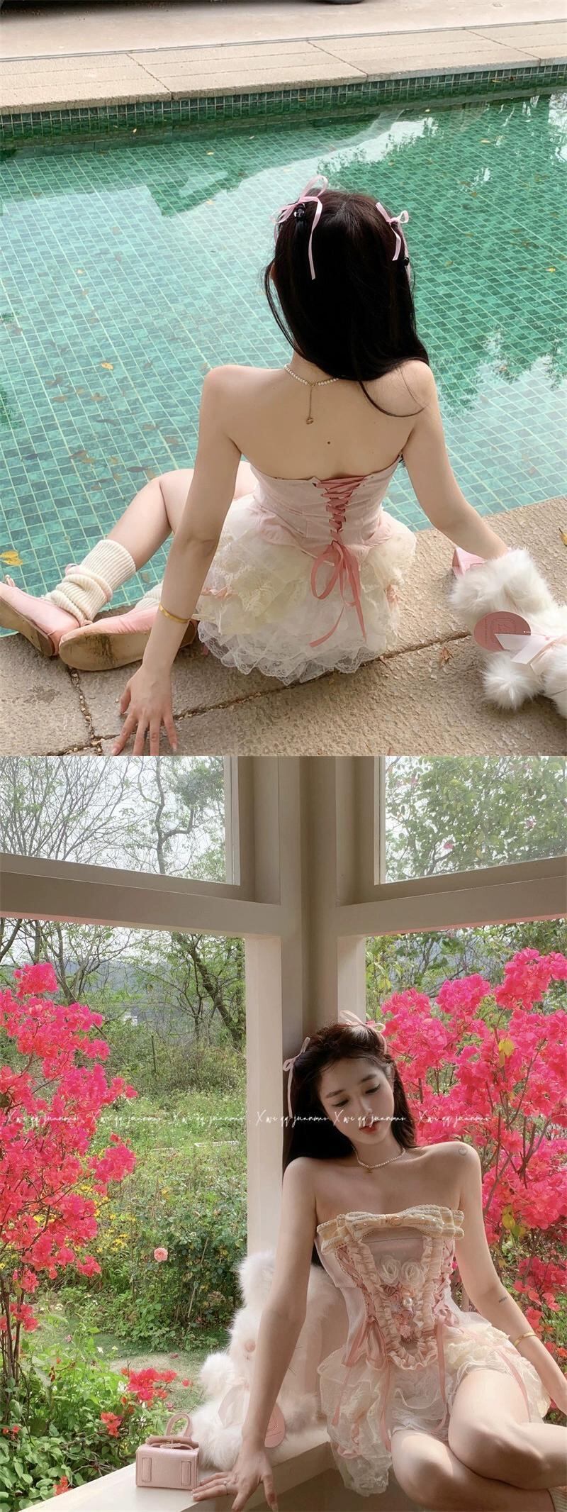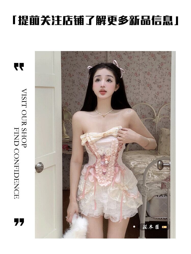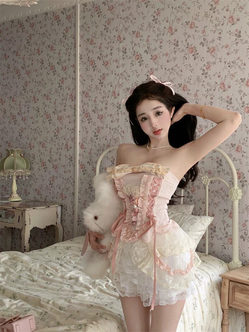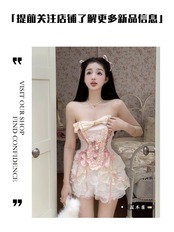 甘いスタイルの純粋な欲望のスーツの女性の夏 2023 新しいストラップフィッシュボーンレースコルセットツーピースショーツと耳エッジ 大人ガーリー スウィート キュート カジュアル サマー 夏物 ブルマー ピュア 0921926023587056