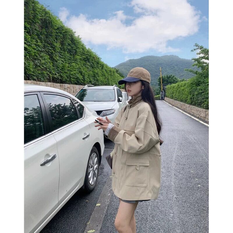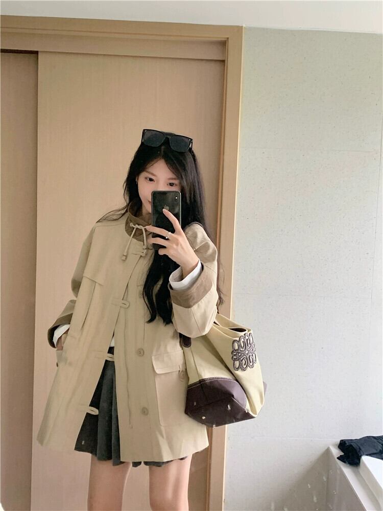 レトロニッチレースアップスタンドアップカラー長袖ウインドブレーカー女性秋 2023 新しいスタイルミッドレングスルーズ痩身多目的コート ロング オータム 秋物 0921972050587366