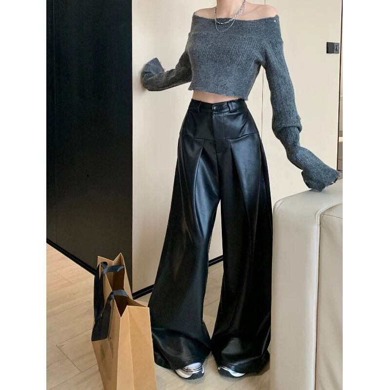 レトロな黒の高級レザーパンツの女性の秋のハイウエストカジュアルストレートパンツルーズでドレープのあるワイドレッグフロアレングスパンツ ブラック オータム 秋物 0921985629626478