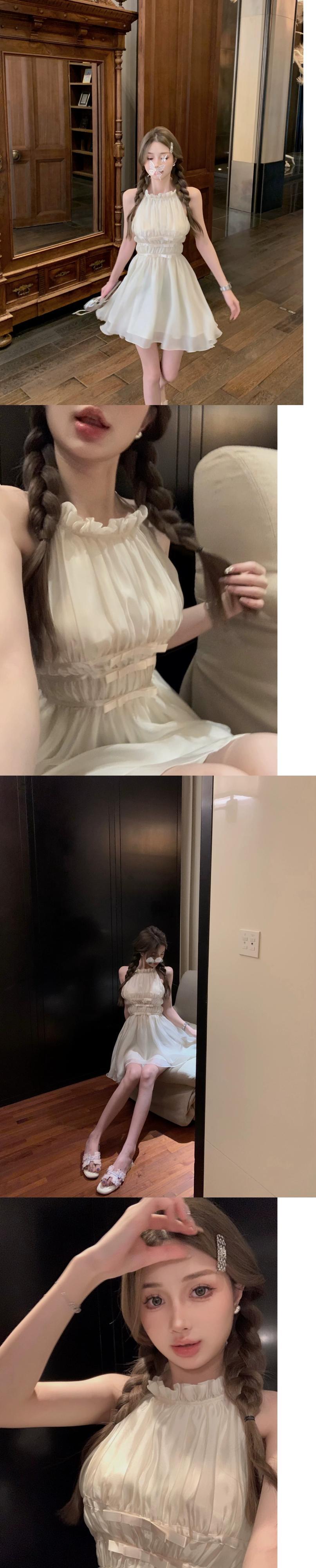 優しい風メッシュホルターネックドレスフェアリーサマーフレンチスカートハイエンドウエストリボンAラインスカート 夏物 0921929092810887