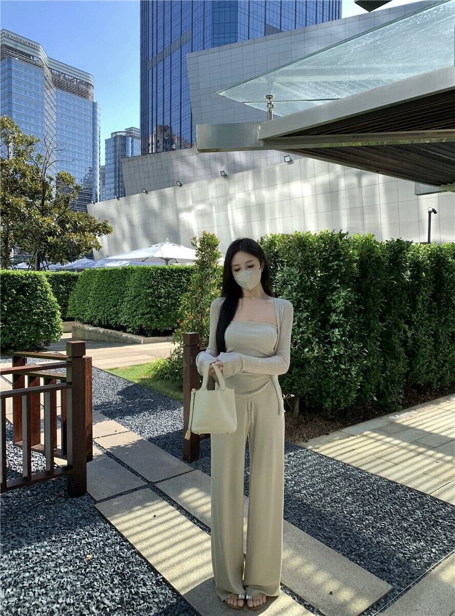 ソリッドカラーの気質ファッションスーツ女性の夏の 2023 新しいニットチューブトップ長袖カーディガンカジュアルパンツ 3 点セット ロング サマー 夏物 0921962741423406