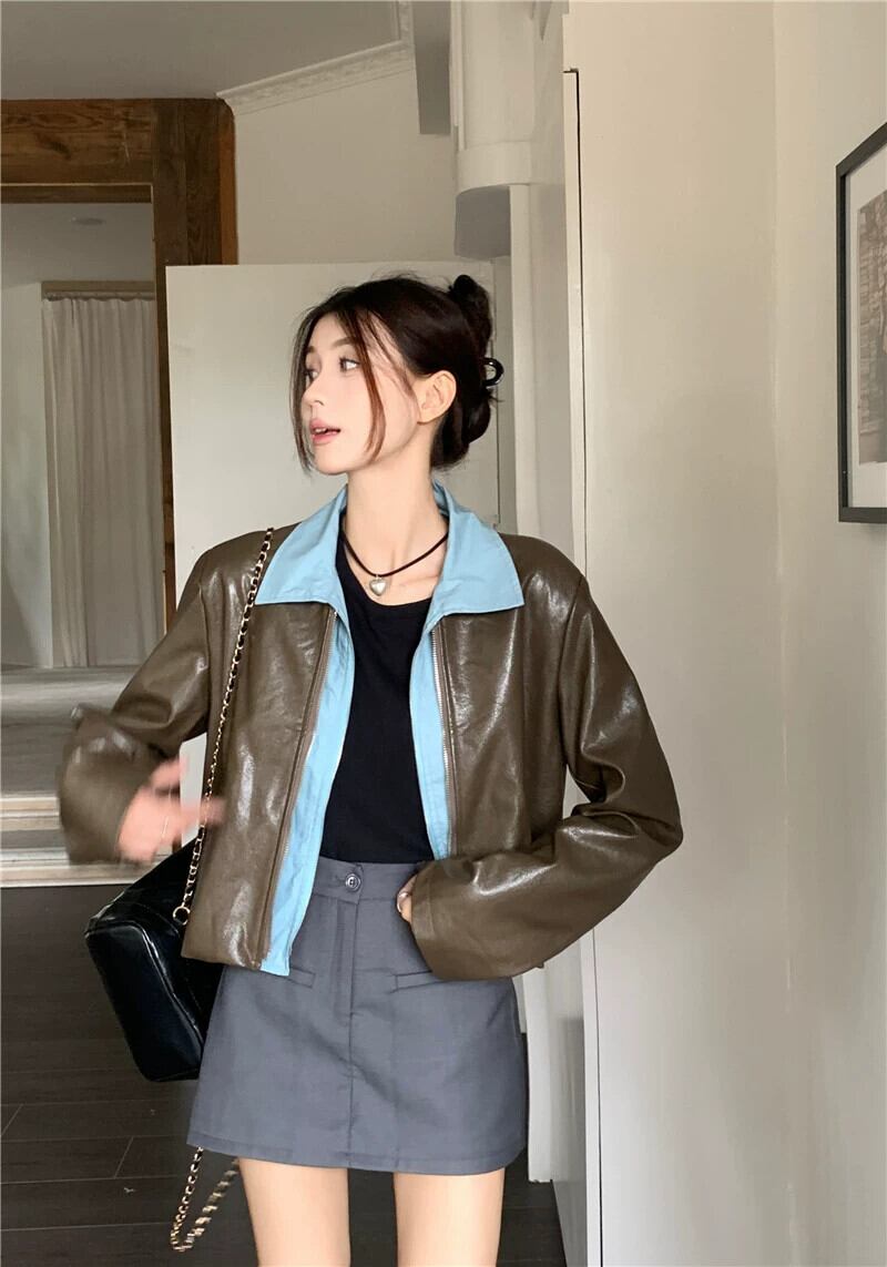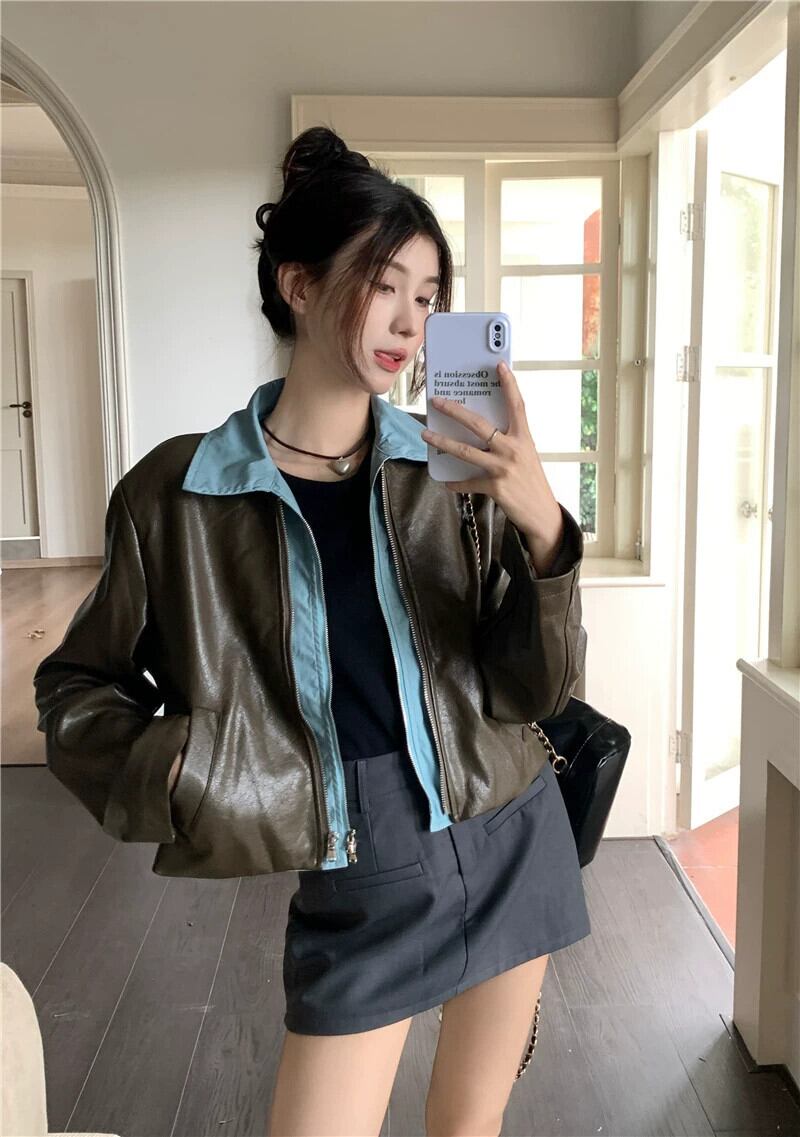 ステッチコントラストカラー長袖レザージャケットレディース2023年初秋新作ショートスタイルルーズでスリムなジッパーカーディガントップ ロング オータム 秋物 0921980560469195