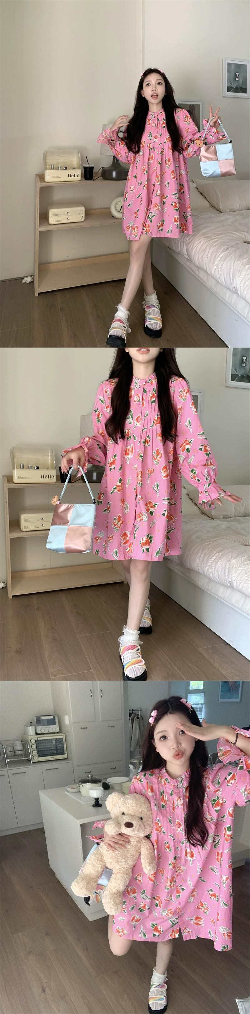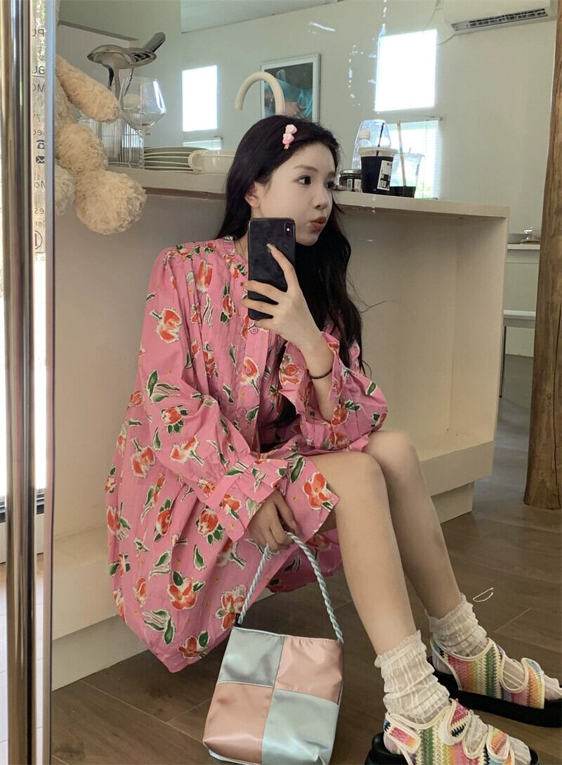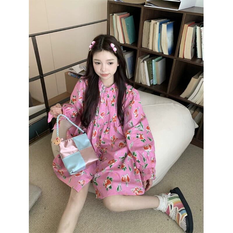 甘いスタイルプリントピンク長袖ドレスの女性の秋 2023 新しいルーズ痩身 a ラインショートスカート ロング 大人ガーリー スウィート キュート カジュアル オータム 秋物 Aライン 0921950517926298