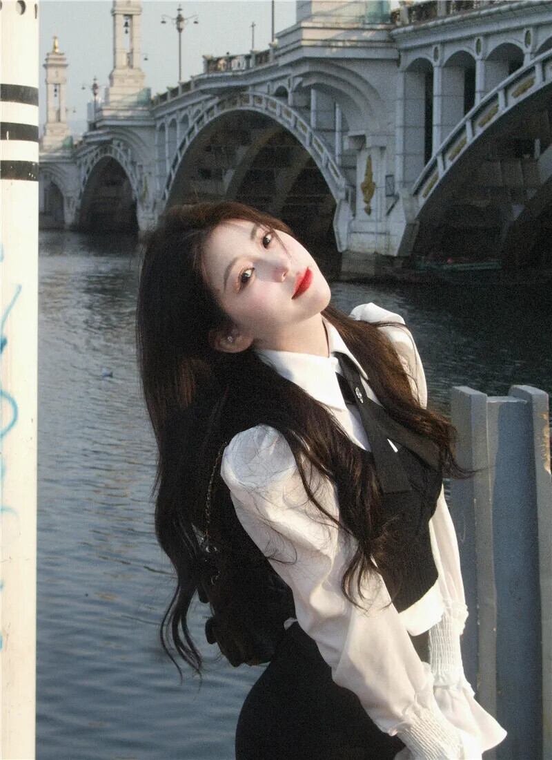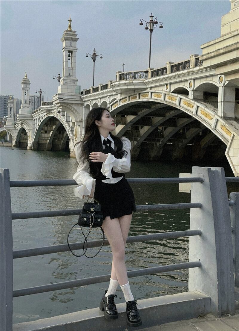 色:シャツ+ブローチネクタイ,黒のベスト,黒の小さなスリットスカート