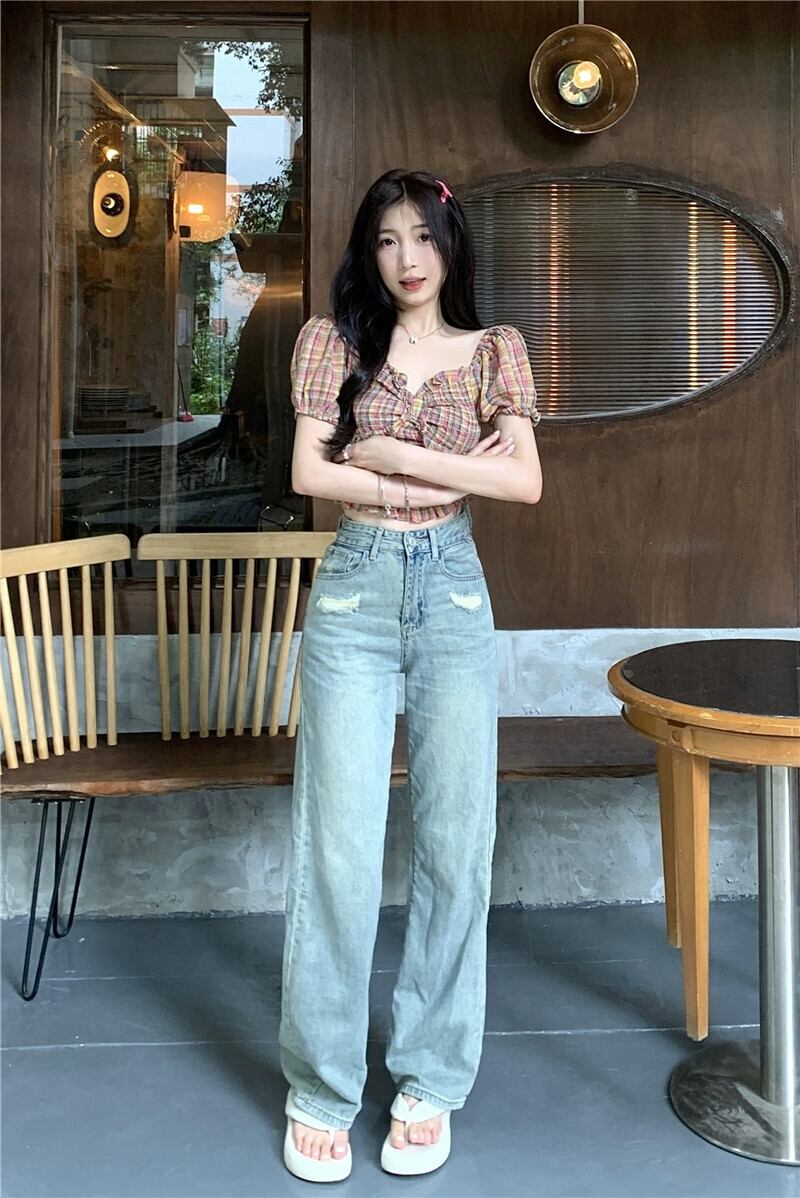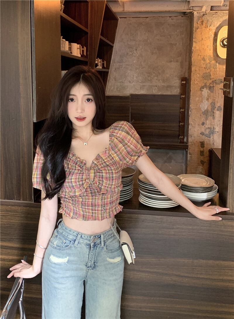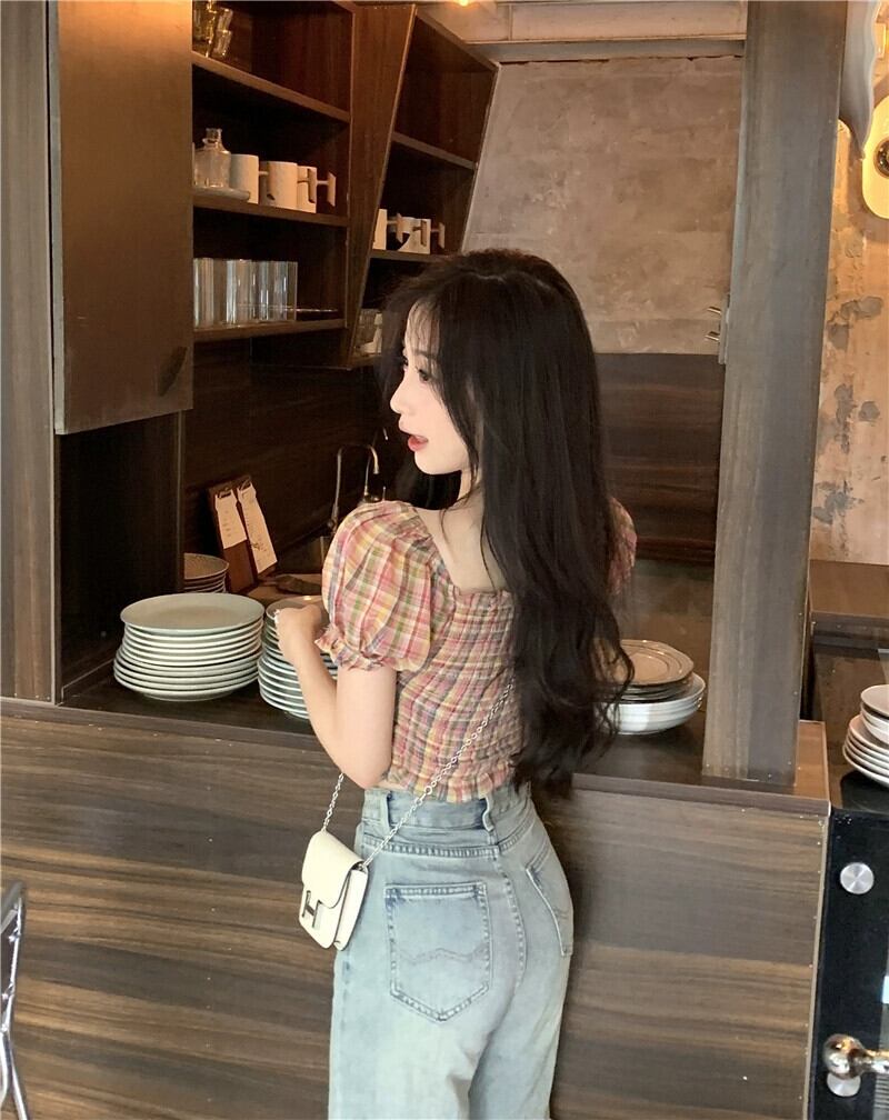 甘辛コントラストカラーチェック柄パフスリーブシャツレディース夏2023ガーリースタイルスリムフィットショートトップ 大人ガーリー スウィート キュート カジュアル サマー 夏物 0921924507813348