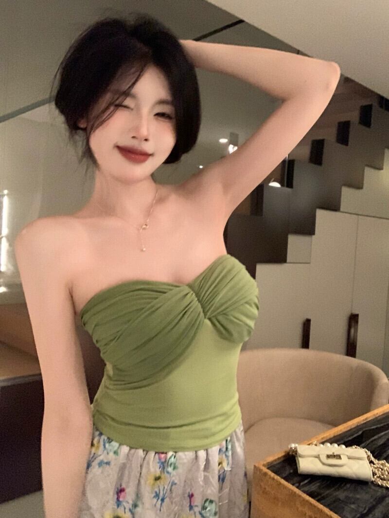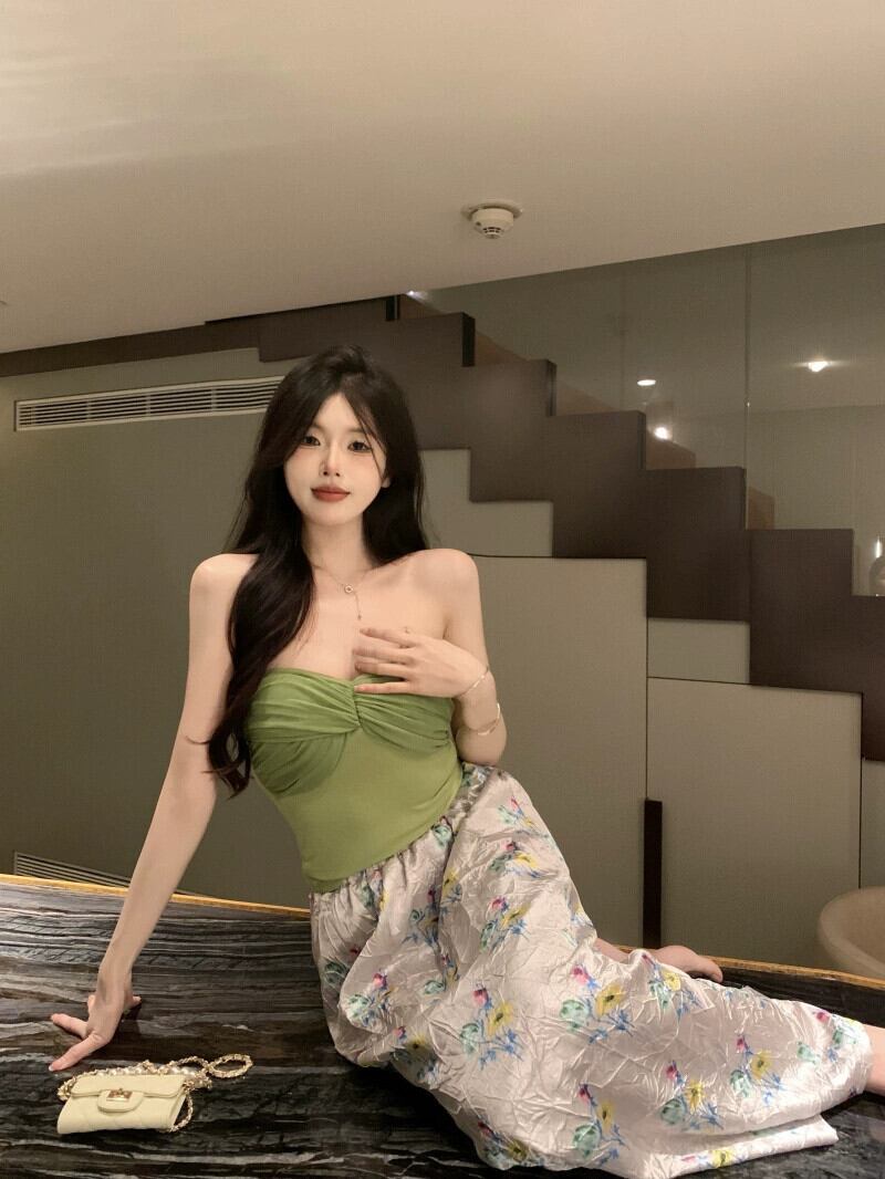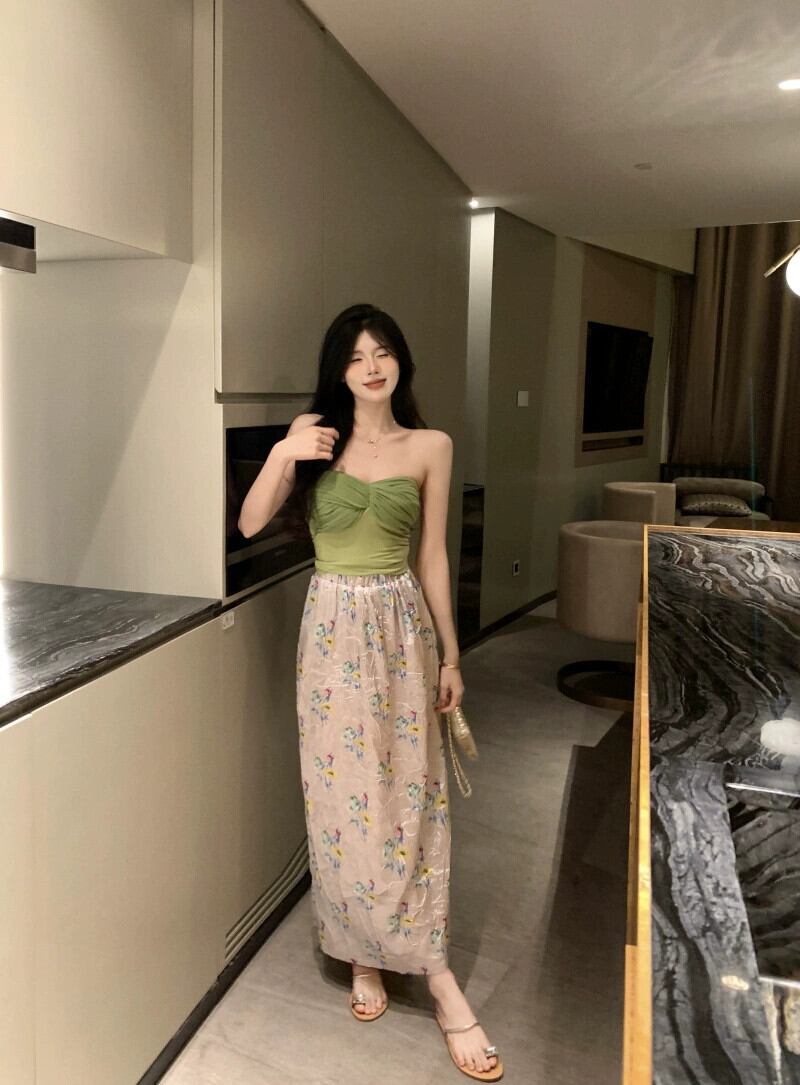 色:グリーンのパッチワークチューブトップ,プリントスカート