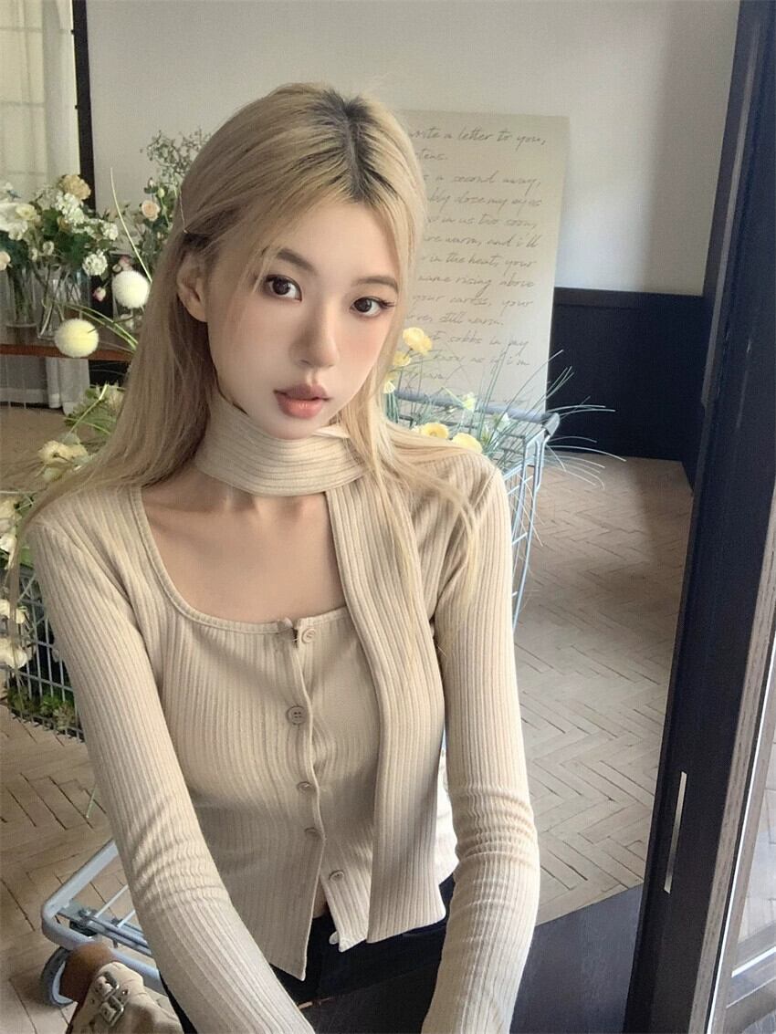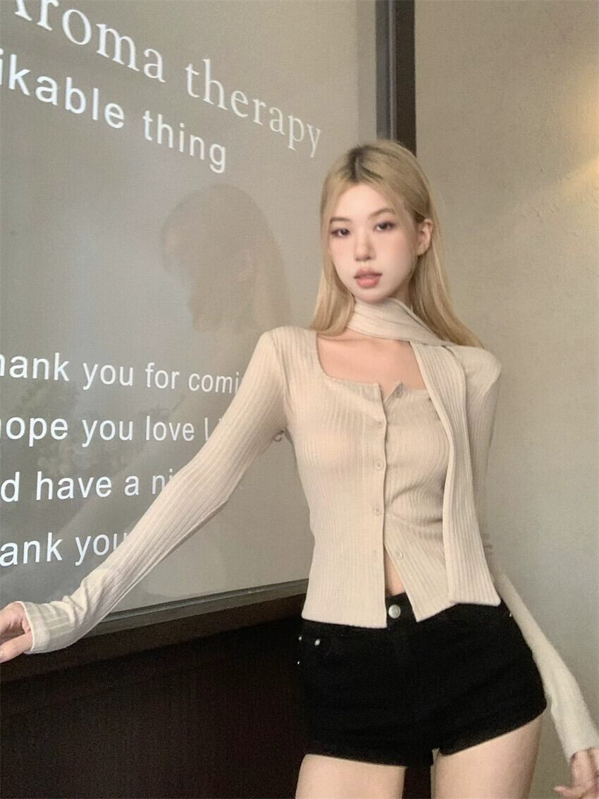 レトロホルターネックスカーフ長袖セーター女性初秋 2023 新しいショートスリムスリムカーディガントップ ロング オータム 秋物 0921962478875528