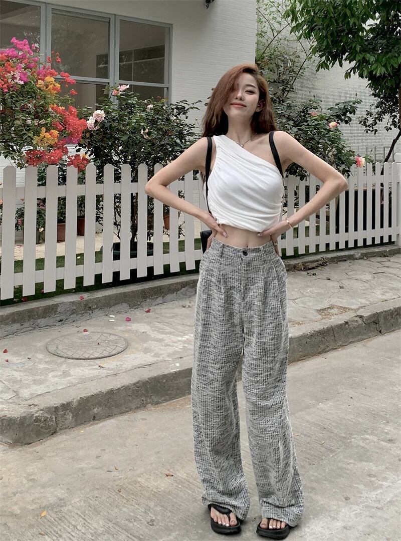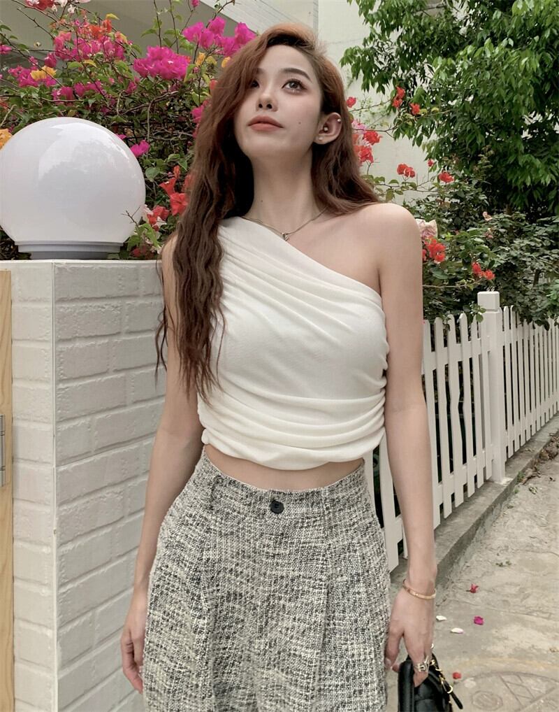 -エンドソリッドカラープリーツ斜めショルダーベスト女性夏2023新しいスタイルの気質ショートスリム痩身ノースリーブトップ サマー 夏物 0921960528744499
