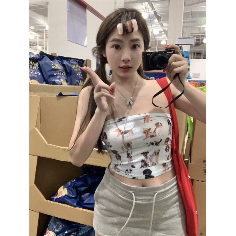 甘くてスパイシーなスタイルのかわいいプリントチューブトップ女性の夏の 2023 新しいセクシーな痩身ショートノースリーブトップ 半袖 ハーフスリーブ 大人ガーリー スウィート キュート カジュアル サマー 夏物 092196032021924