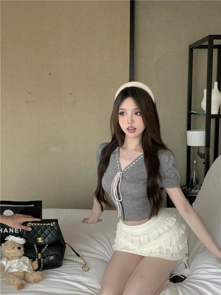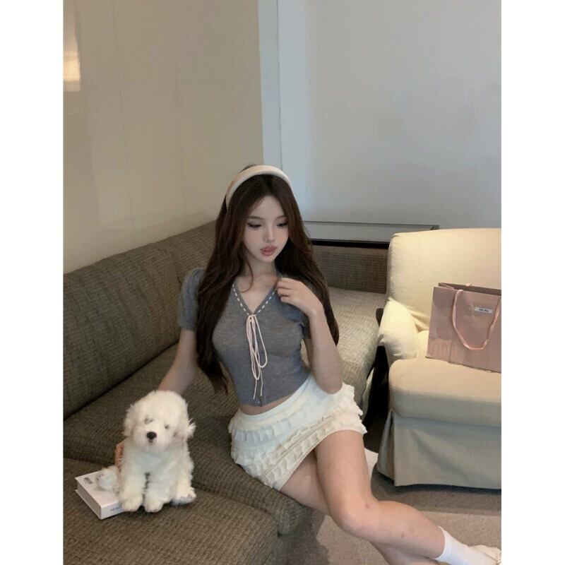 バレエ甘いスタイルレースアップ薄い半袖ニット Tシャツ女性の夏の 2023 新しい気質ショートスリムトップ 大人ガーリー スウィート キュート カジュアル サマー 夏物 0921970334822746