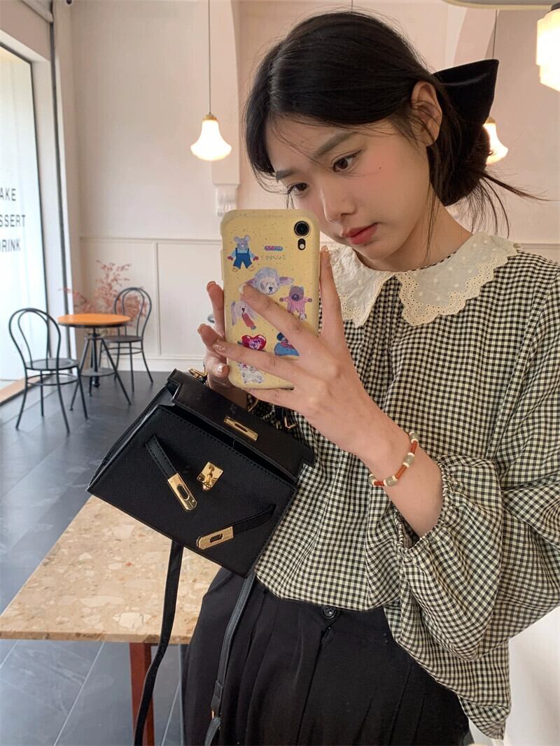 甘いラウンドネックレース長袖シャツ女性の 2023 秋の新しいコントラストチェック柄ルーズで汎用性の高いシャツ ロング 大人ガーリー スウィート キュート カジュアル オータム 秋物 Oネック 0921912300122791