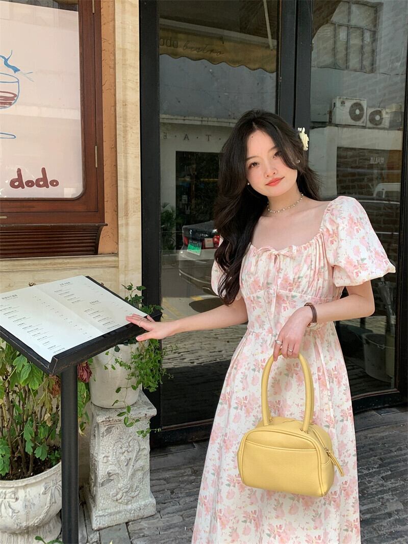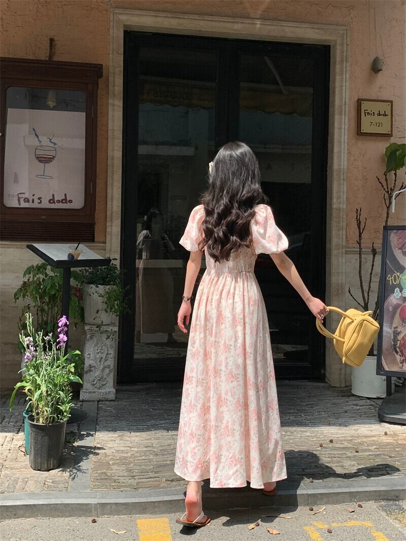 甘い花柄スクエアネック半袖ドレス女性の夏のフレンチ牧歌的なスタイルのスカートパフスリーブウエスト A ラインロングスカート 大人ガーリー スウィート キュート カジュアル サマー 夏物 Aライン スクウェア 0921982575433428