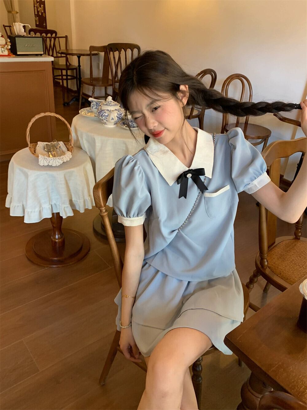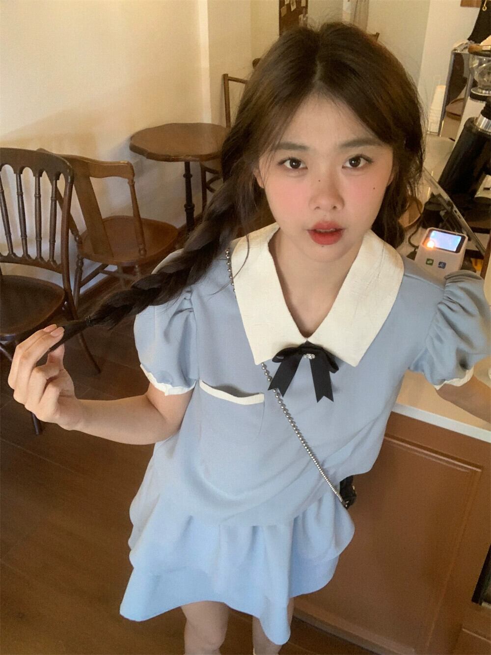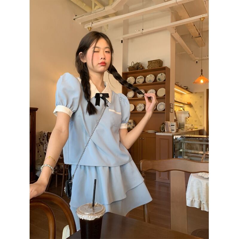 甘い義理の娘プチスーツ女性 2023 夏の新しいスタイルのリボンコントラストカラートップとスカート 2 点セット 大人ガーリー スウィート キュート カジュアル サマー 夏物 0921984738748684