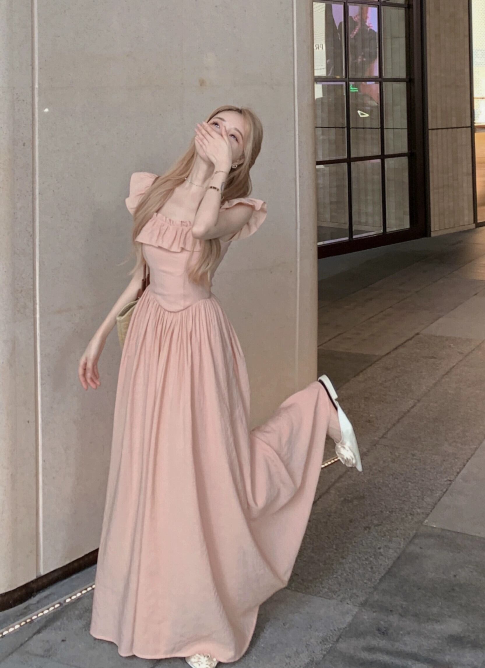 純粋な欲望優しい風スクエアネックフリル小さなフライングスリーブドレス女性の夏のティーブレイクミッドロングスカートウエスト A ラインスカート サマー 夏物 Aライン スクウェア 0921927012229316