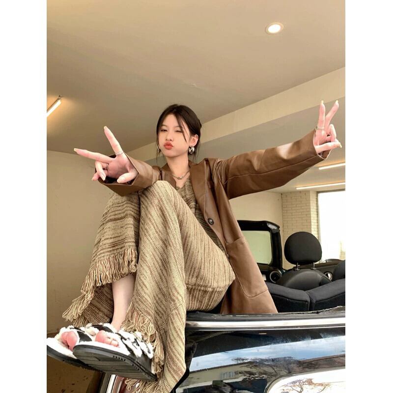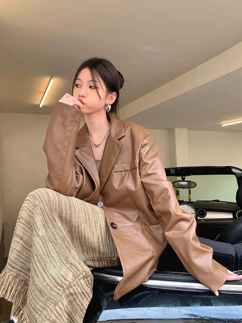 有能なデザイン長袖レザージャケット女性秋 2023 新しいミッドレングスのスーツの襟スリムブラウンスーツ ロング オータム 秋物 0921951809937508