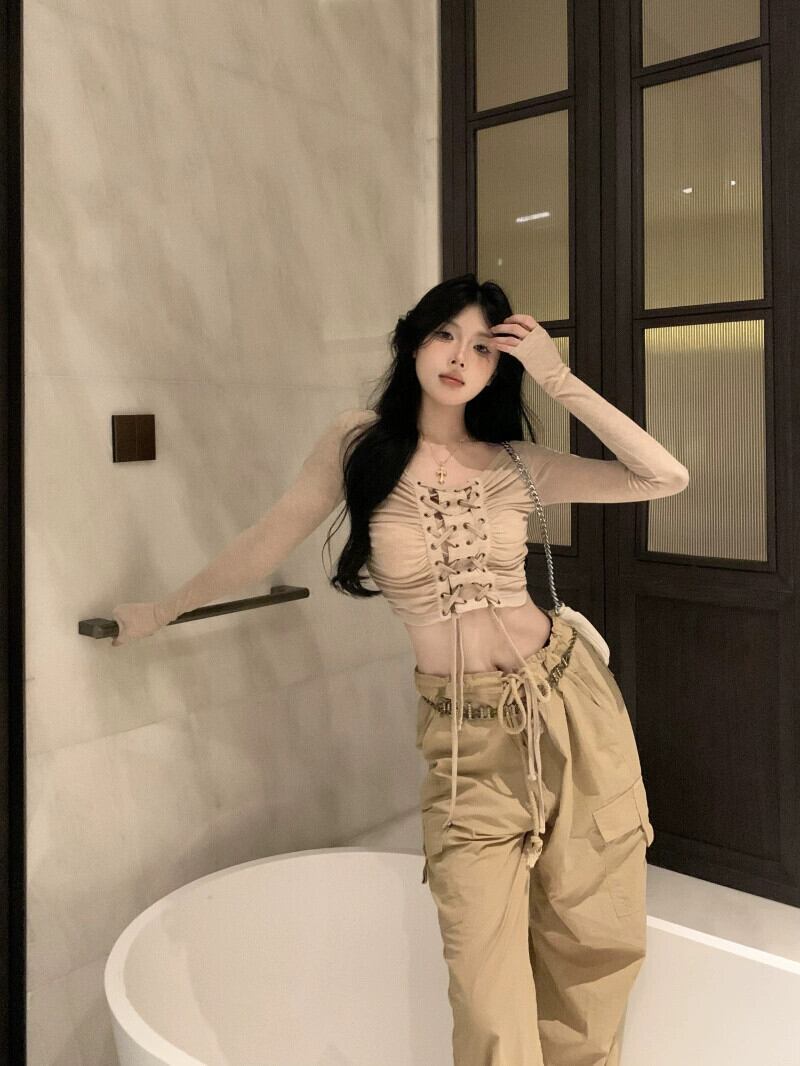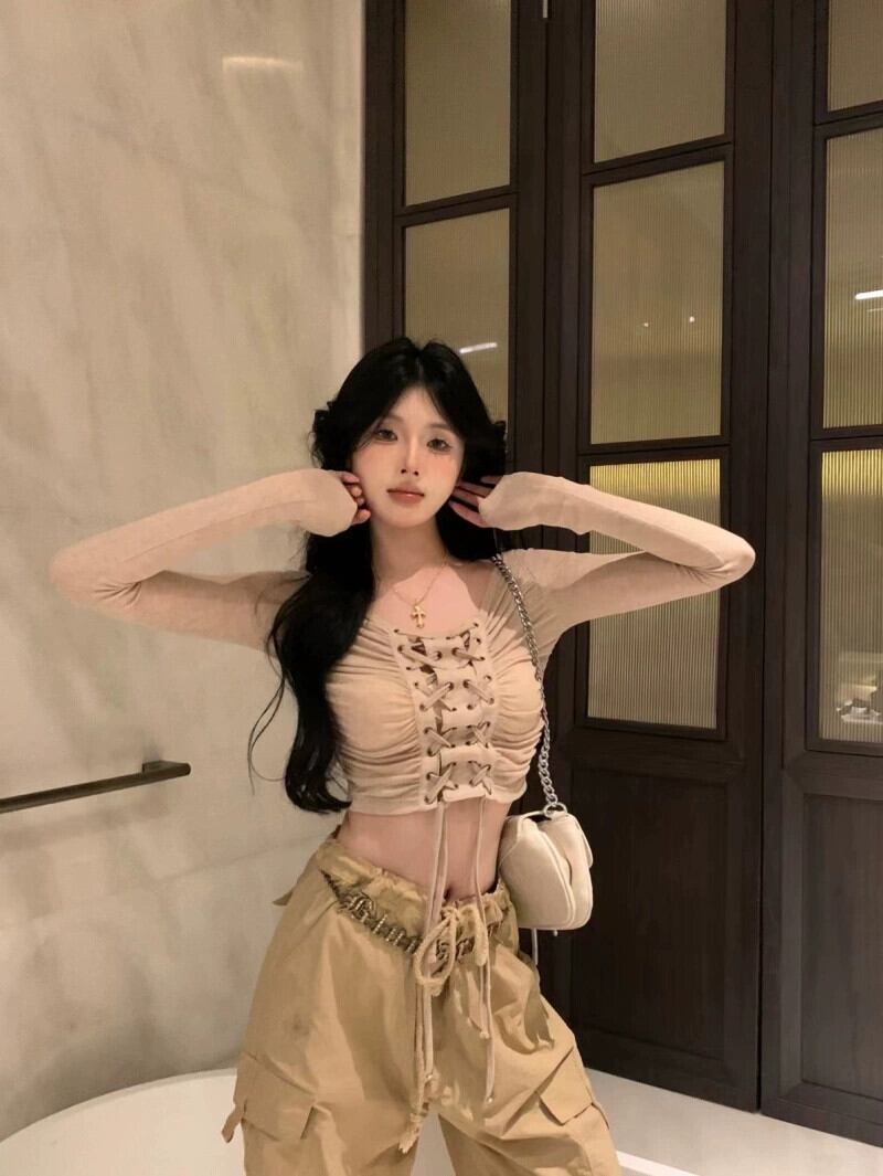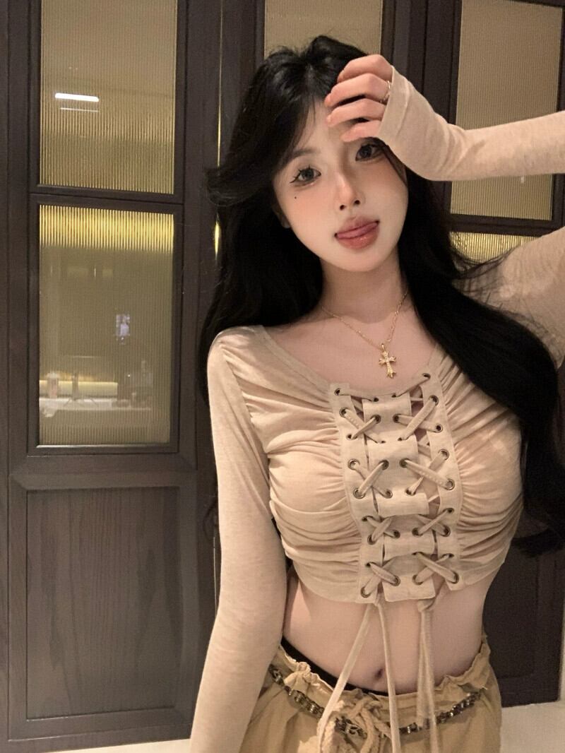 ホットストラップ中空長袖 Tシャツ女性初秋 2023 新しい気質ショートスタイル痩身日焼け止めトップトレンディな ロング オータム 秋物 0921984559553197