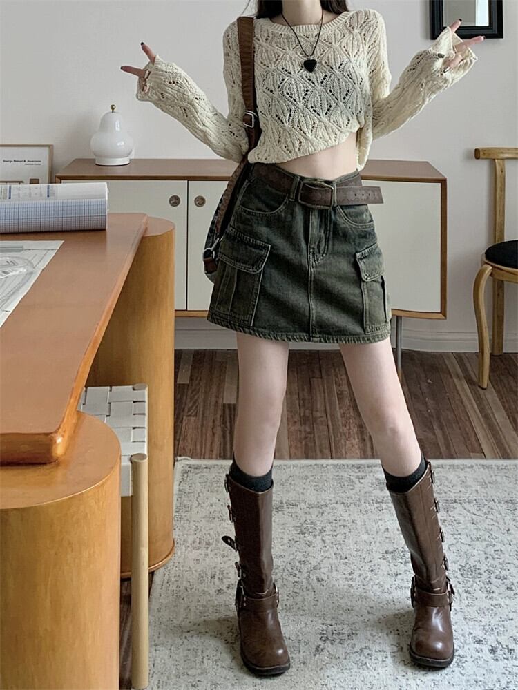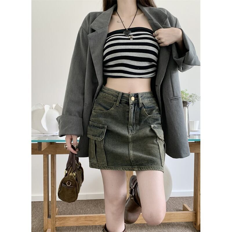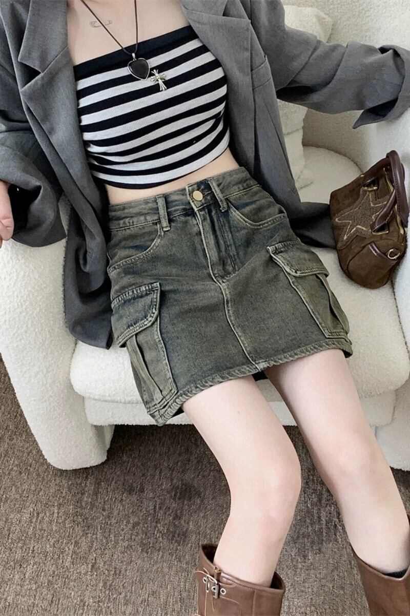 アメリカンレトロネクタイワークウェアデニムスカート女性の夏 2023 新しい気質多目的ショート A ラインスカート サマー 夏物 Aライン 092193172748065