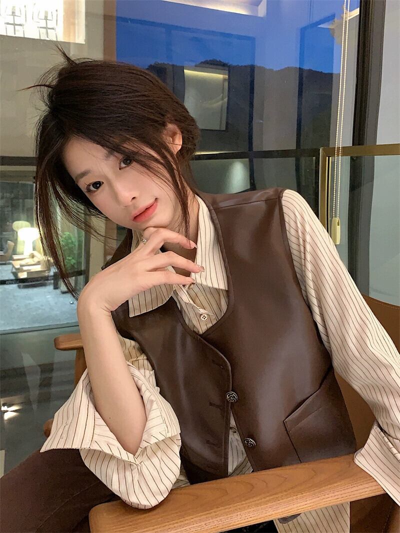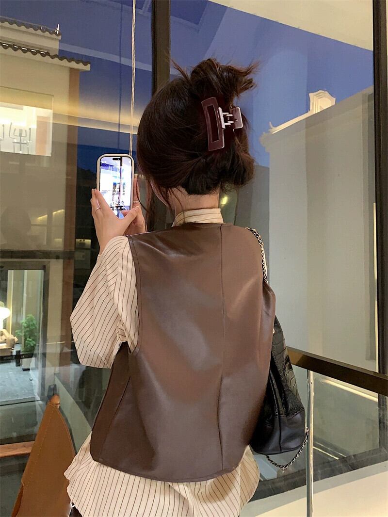 レトロファッションノースリーブレザーベスト女性秋 2023 新しいスタイルショートスリムで多用途なベスト オータム 秋物 0921965122830999