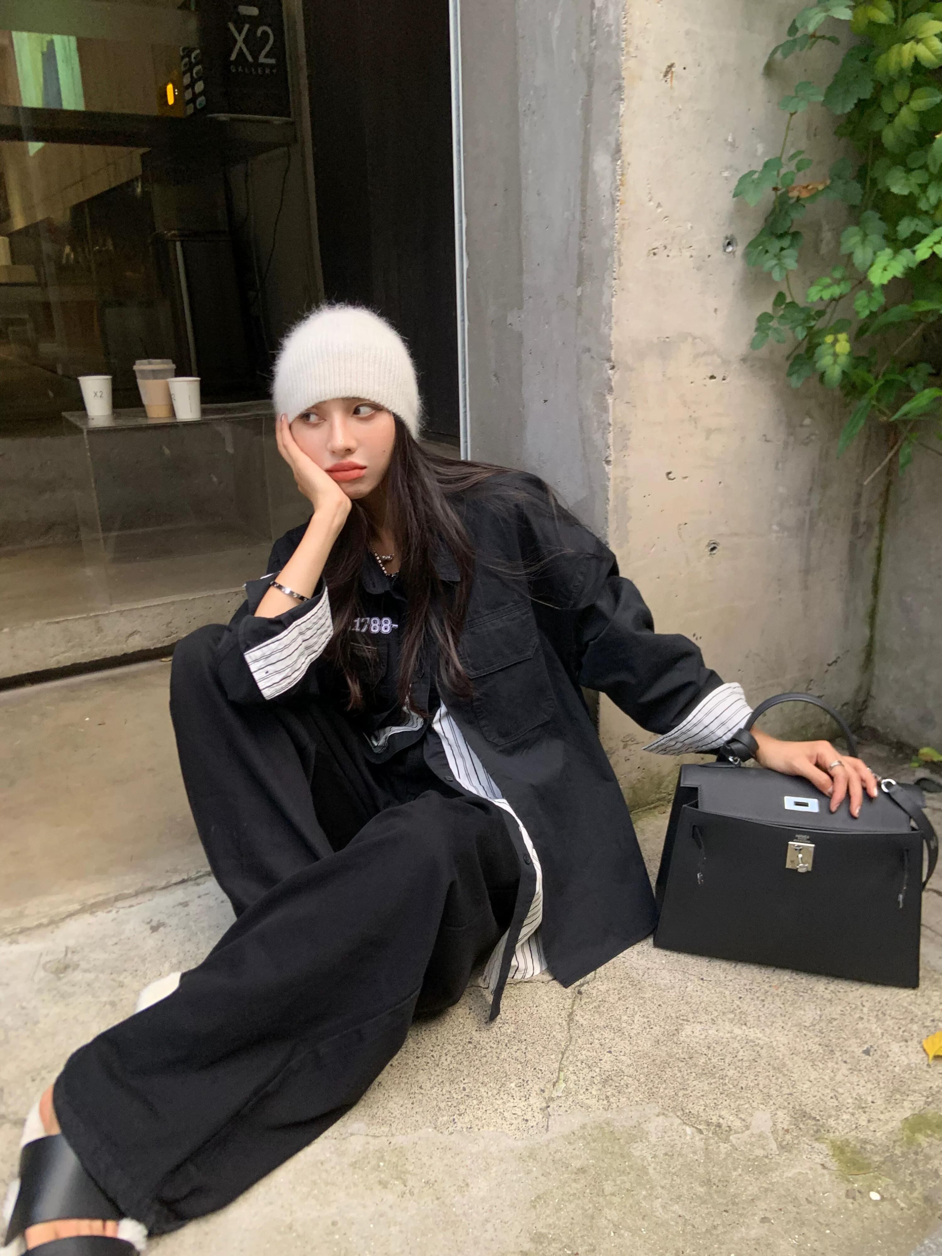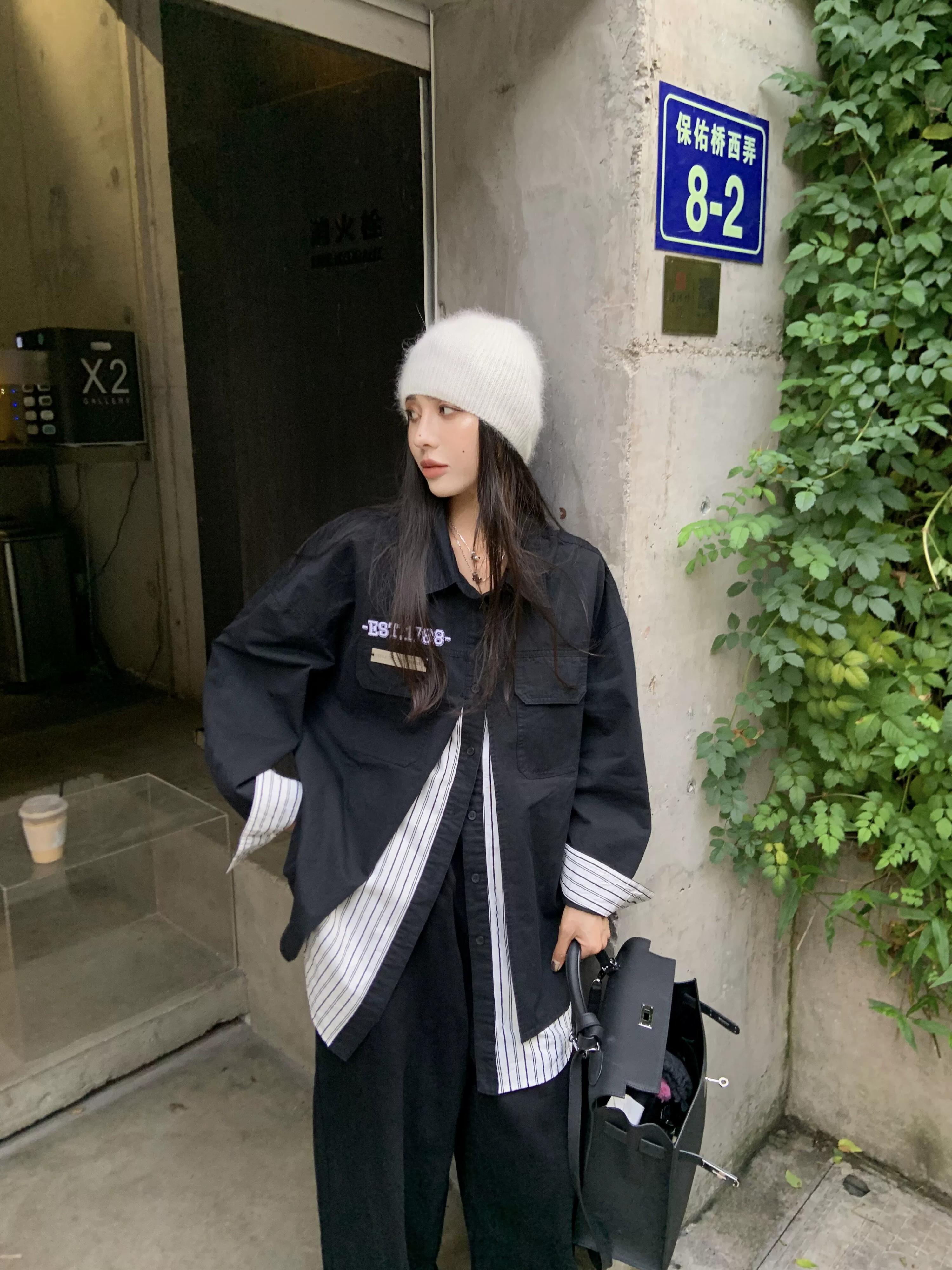 ワークスタイルファッショナブルな偽ツーピース長袖シャツ女性秋 2023 新しいスタイルのポロ襟コントラスト刺繍ルーズジャケット ロング レッド オータム 秋物 0921917099333247