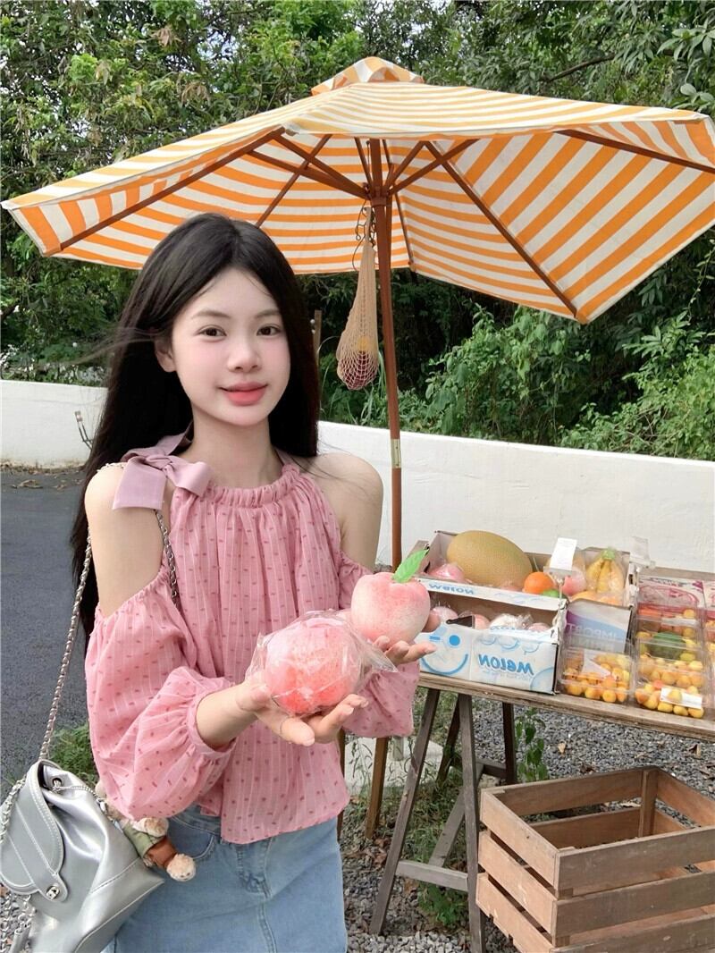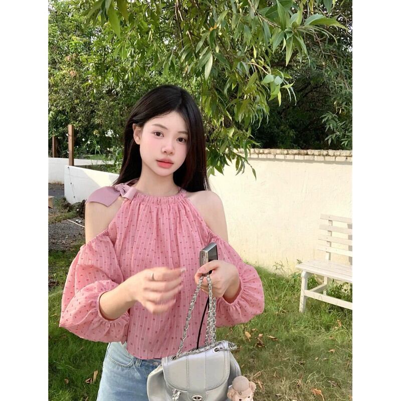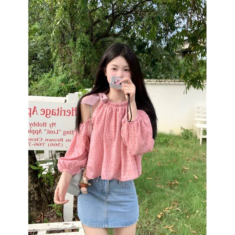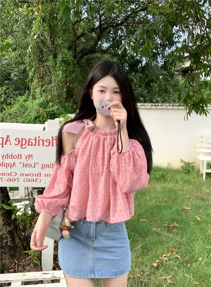 フレンチスイートリボンオフショルダー長袖シャツレディース2023年夏新デザイン万能ショートトップ ロング 大人ガーリー スウィート キュート カジュアル サマー 夏物 0921913025801196