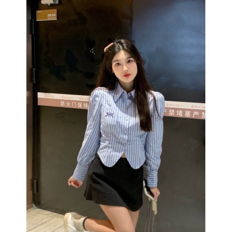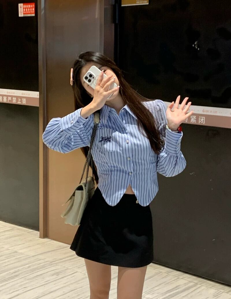 シックな刺繍ストライプ長袖シャツの女性の秋の甘いスリムショートシャツ、気質と痩身トップ ロング レッド 大人ガーリー スウィート キュート カジュアル オータム 秋物 0921988592835837