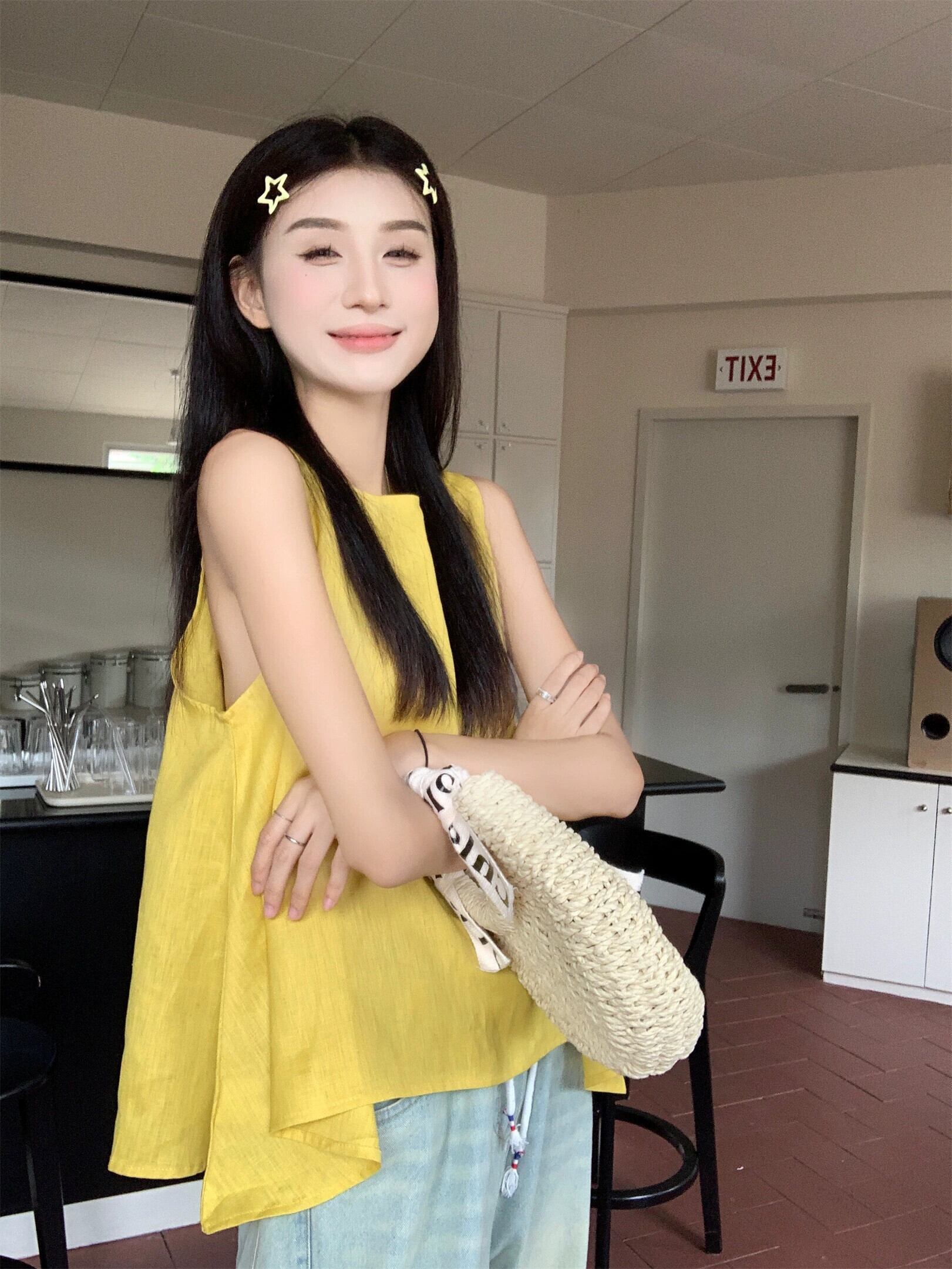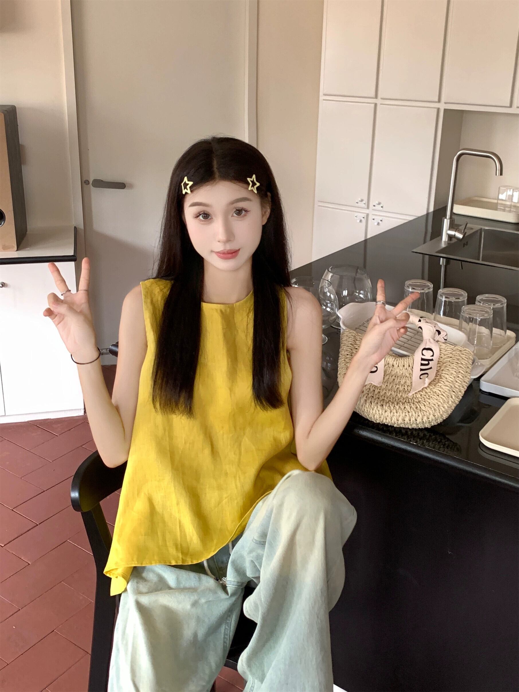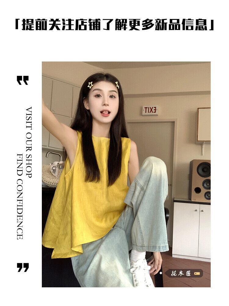 ドーパミンガールソリッドカラーリネンベスト女性の夏 2023 年齢軽減多用途スリムラウンドネックノースリーブトップ サマー 夏物 Oネック 0921998274250493