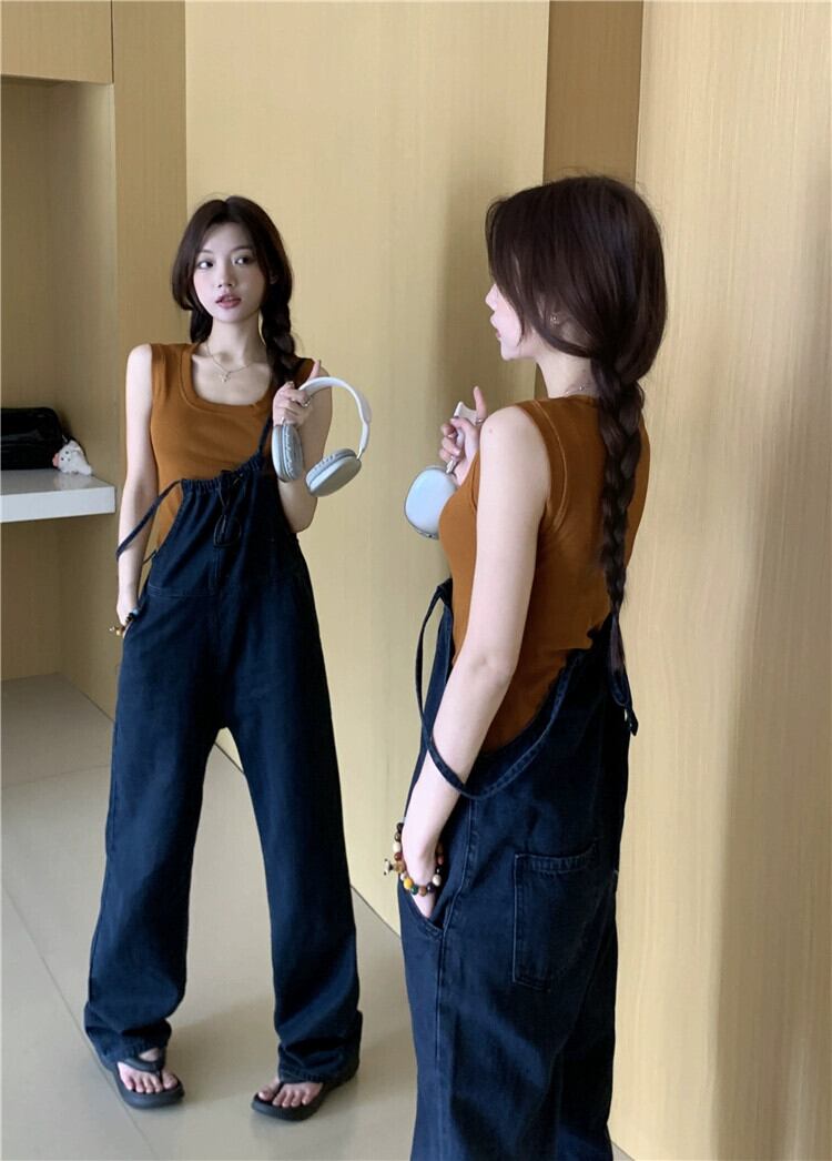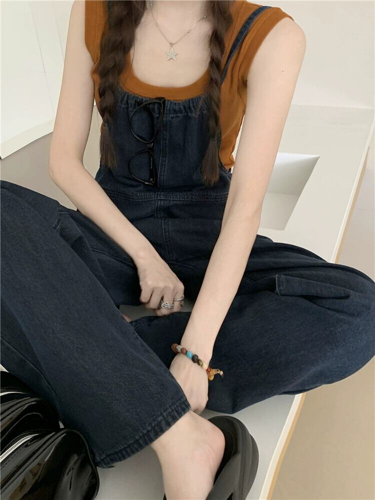 スタイルデザインレースアップワンピースジーンズ女性夏 2023 新しい多用途ハイウエストスリムサスペンダーロングパンツ サマー 夏物 0921989236597813